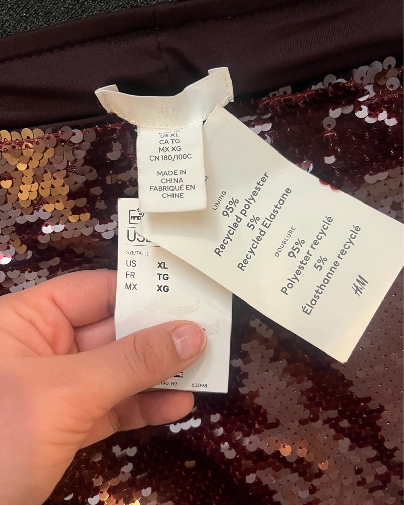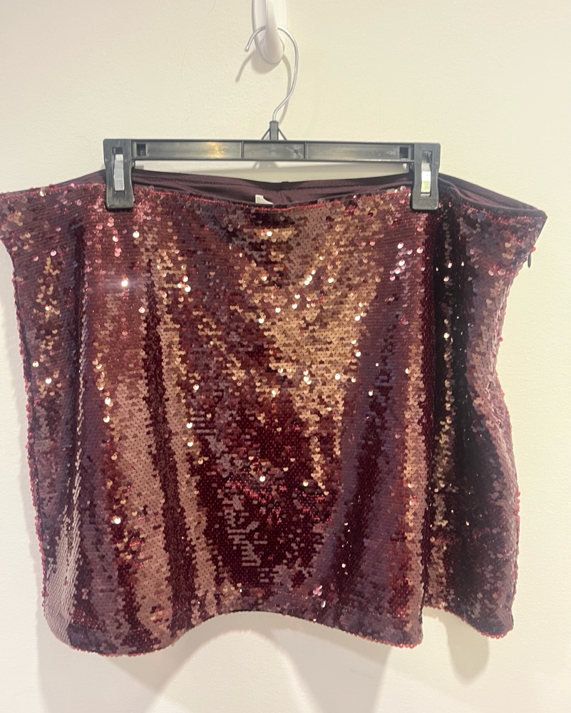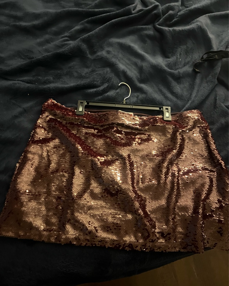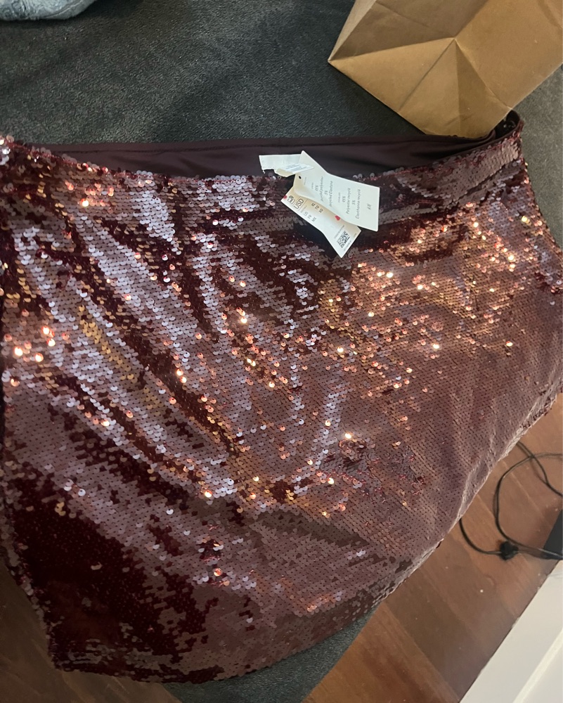 Red Sequin Skirt. New with tags. Size XL and best fits sizes L-XL. Zips and buttons on the side. Has slip underneath. In perfect condition! Polyester and elasthane.
