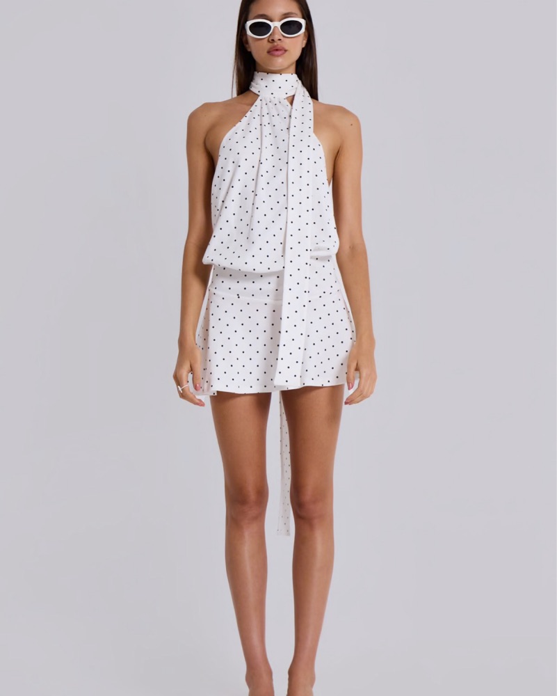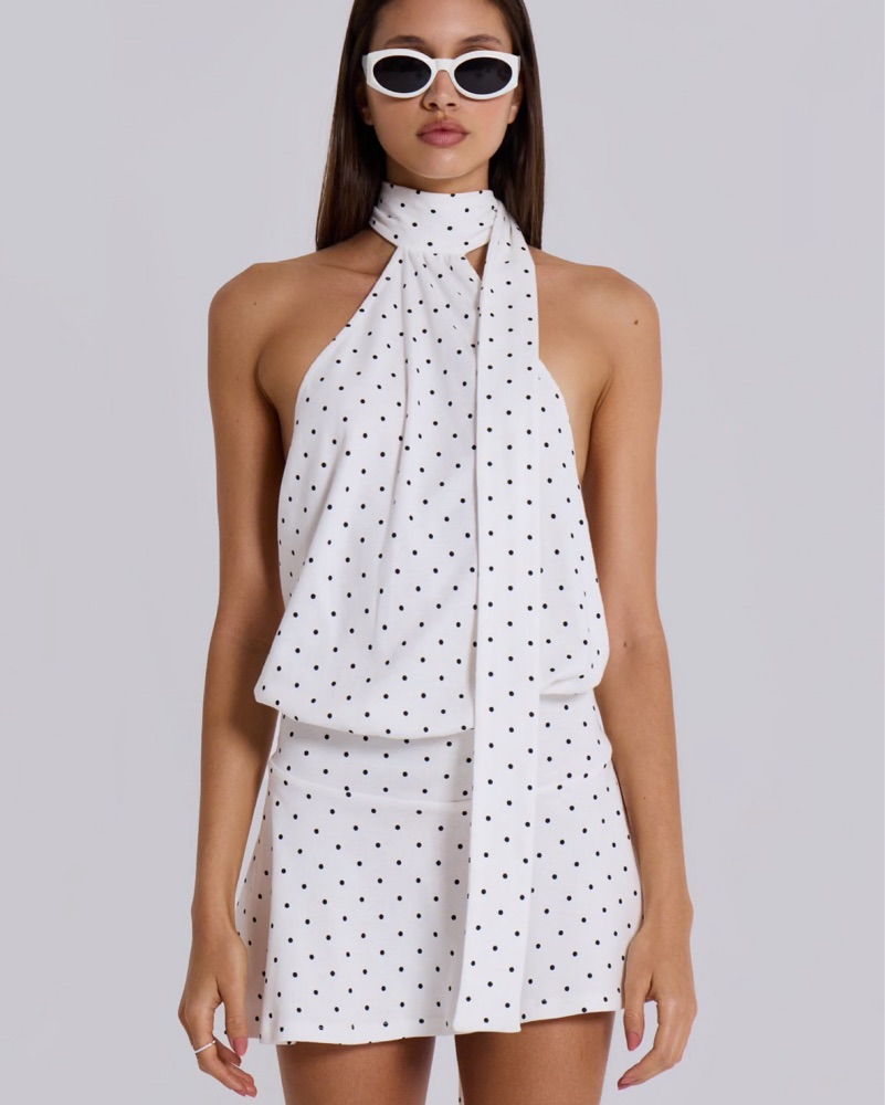 This playful polka dot dress is perfect for a chic brunch or a fun night out with friends. The flattering halter neckline and flirty mini length make it a stylish and versatile option.