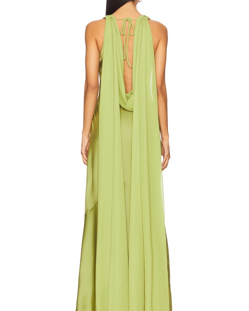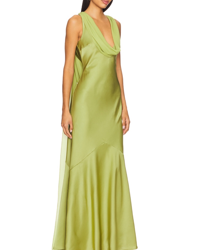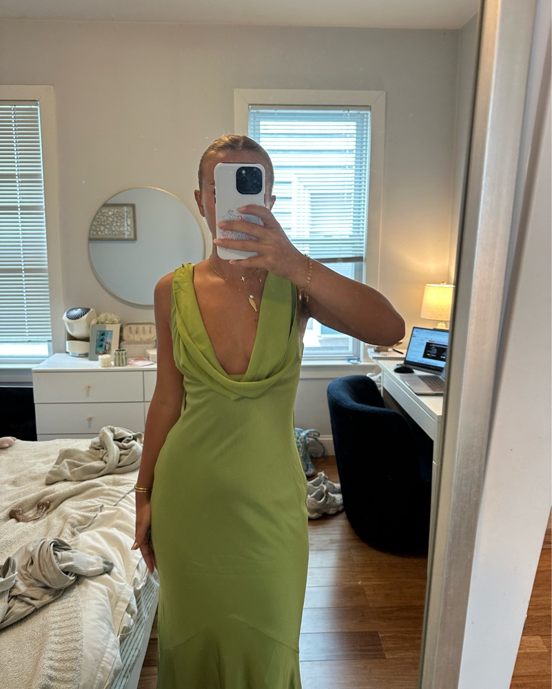 Olive color, perfect for a formal occasion or black-tie event. Beautiful condition! I’m 5’5 and it’s perfect length with a pair of heels.