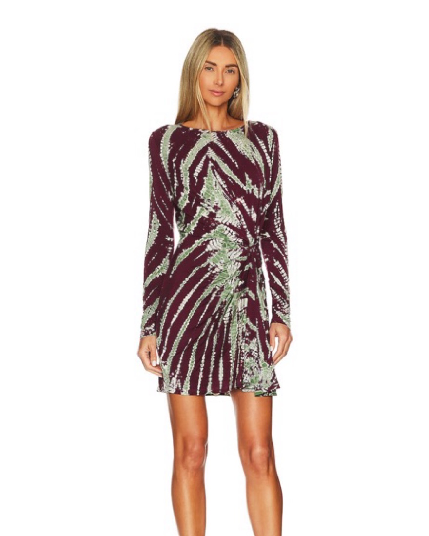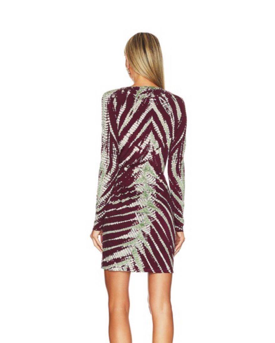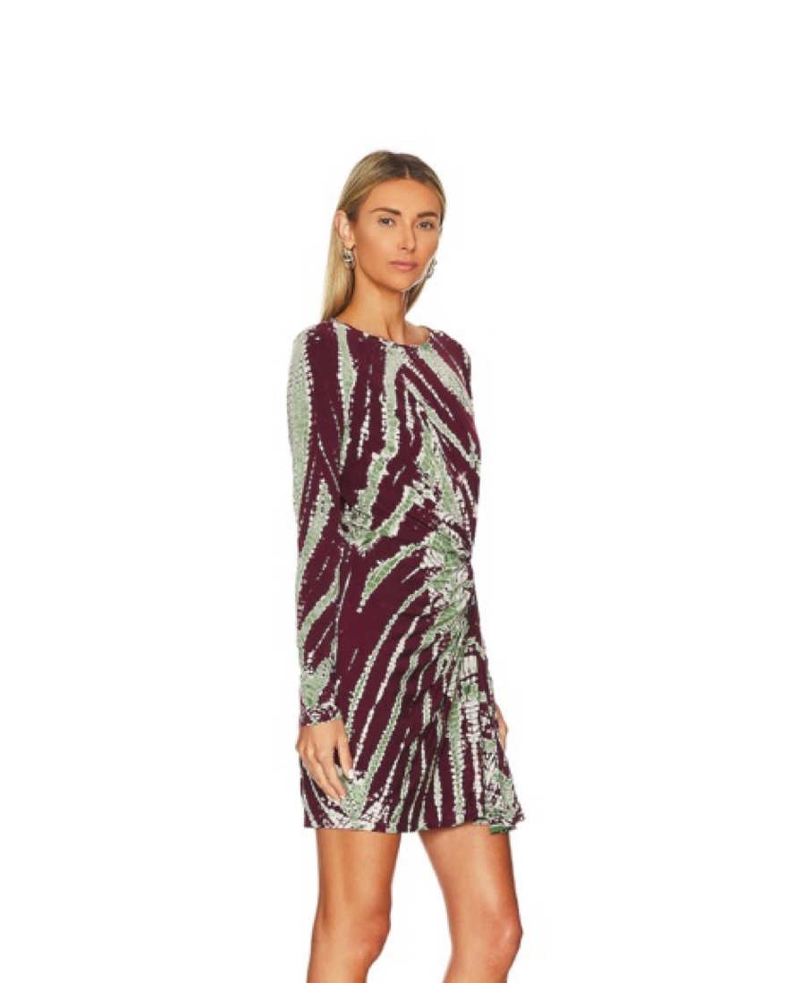 Long sleeve purple and green tie dye dress with ruched knot on the side
