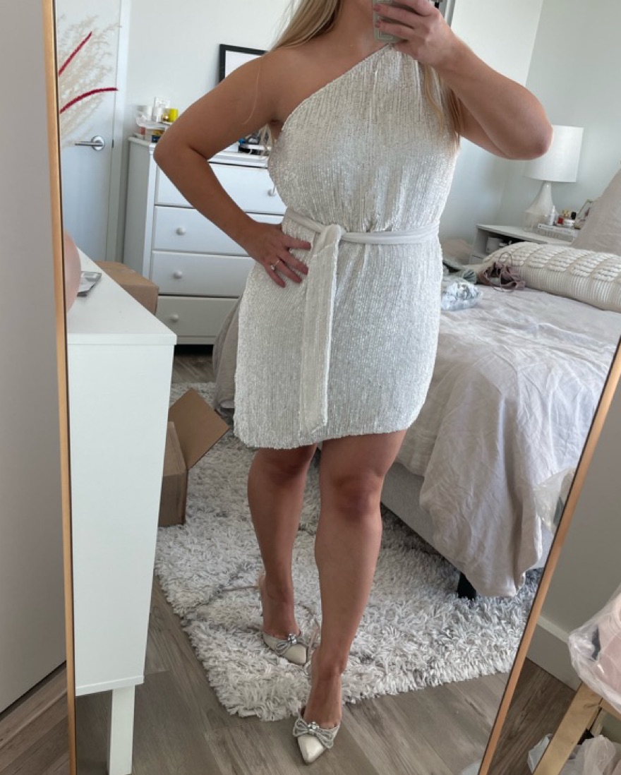 The cutest bridal or bachelorette dress! Worn once and in great condition. Please be very gentle with it! Can be belted to fit smaller sizes. “Ella" dress in sequined georgette.