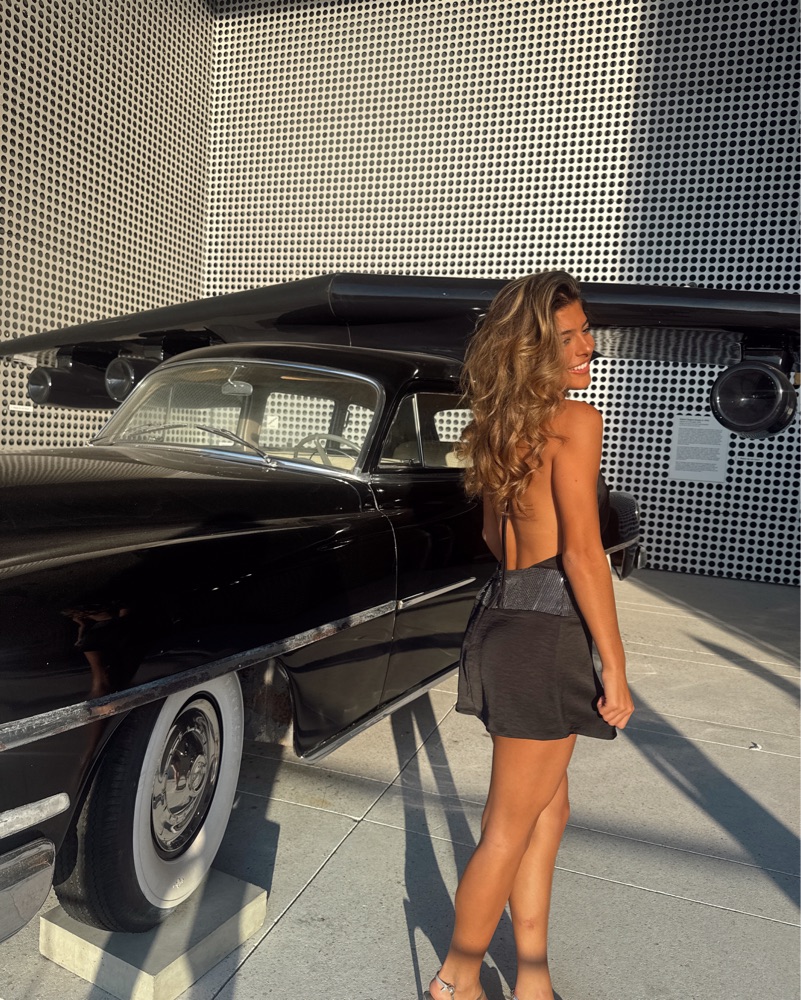 This sleek and alluring black mini dress is perfect for a night out on the town or a chic cocktail party. The form-fitting silhouette and open back design create a sultry, confident look