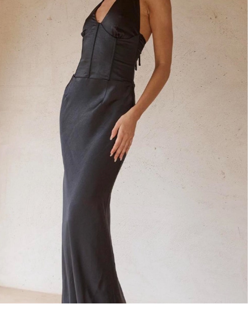Stunning halter neck maxi dress for a formal event. Flattering silhouette and luxurious fabric.