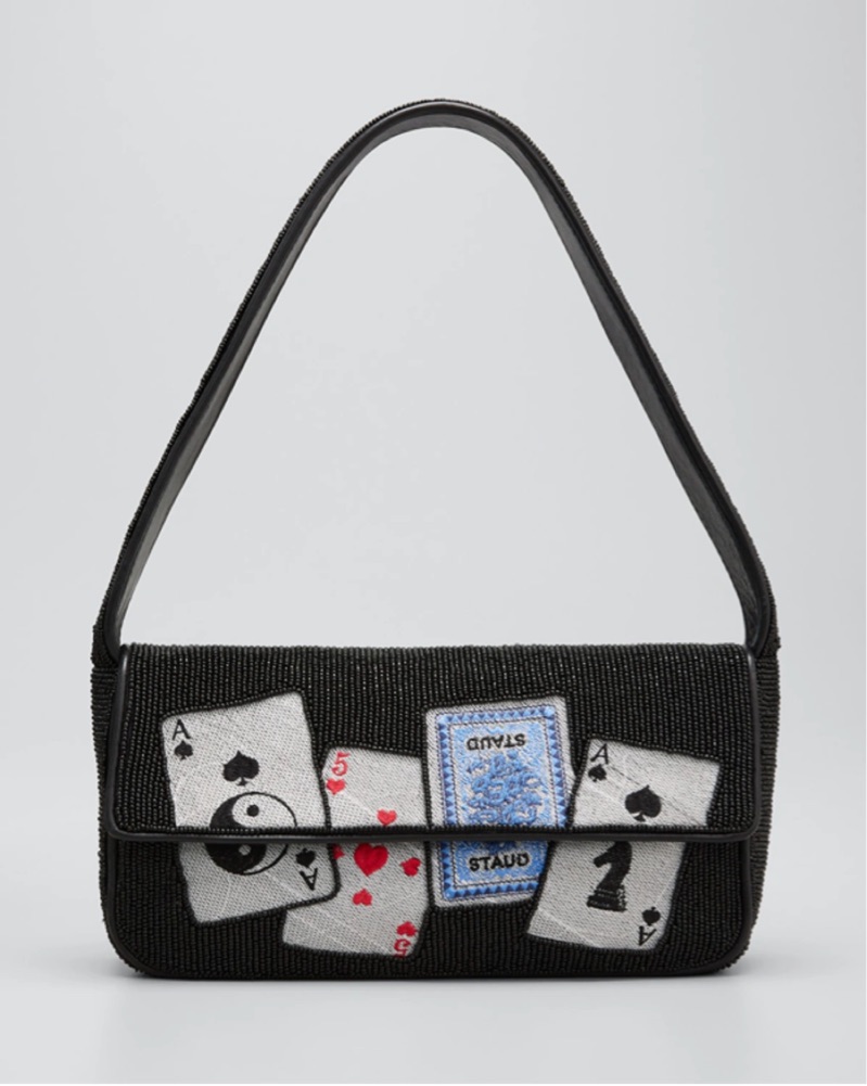 Staud Tommy beaded shoulder bag with leather trim. Shoulder strap. Flap top with dual snap closure. 5.5"H x 10.2"W x 2"D. Sold out everywhere. So cute for a Vegas trip or a night at the casino!