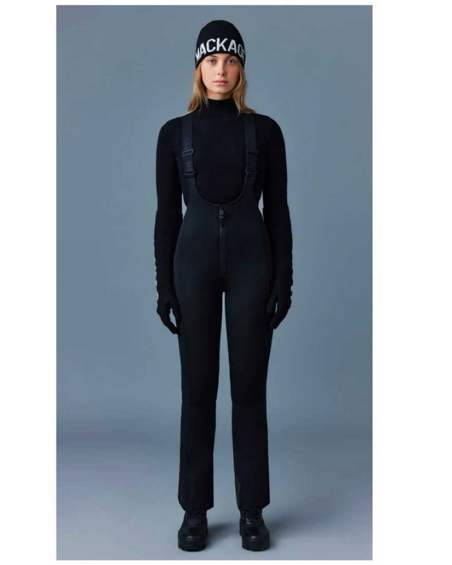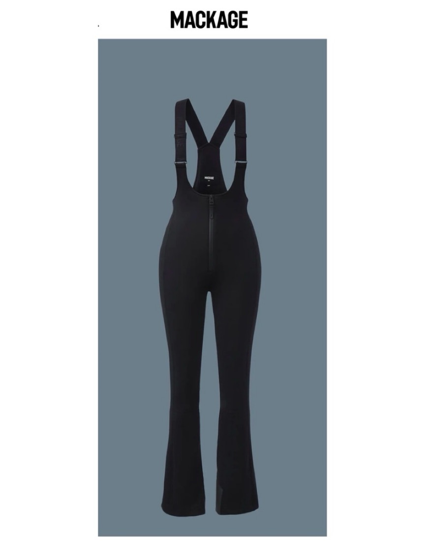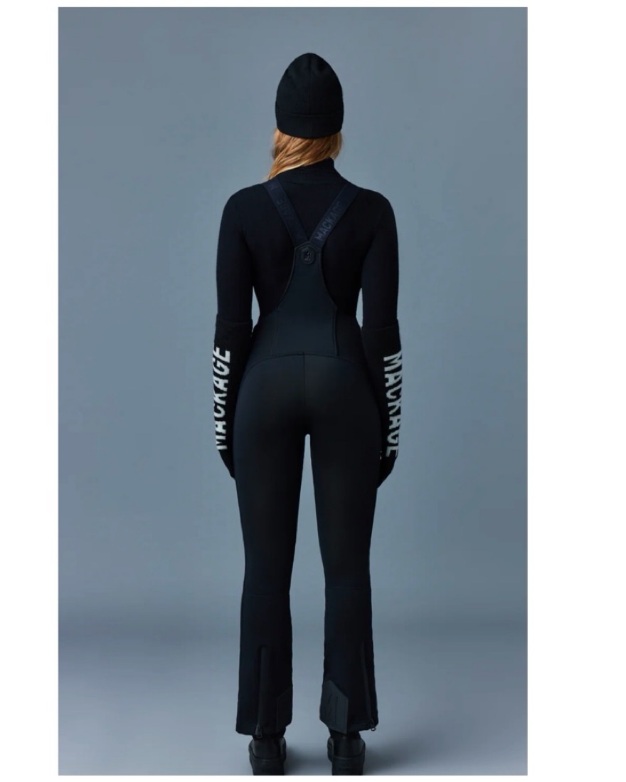 This chic and versatile ski jumpsuit is perfect for hitting the slopes in style. It features a sleek black design with a high collar and adjustable straps for a customized fit. Mackage, moncler, Goldebergh, Aspen, Courchevel, Apres, Vail.