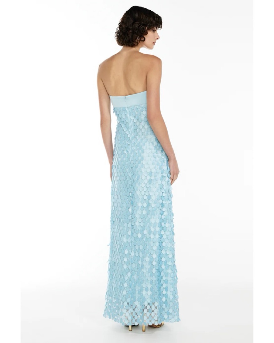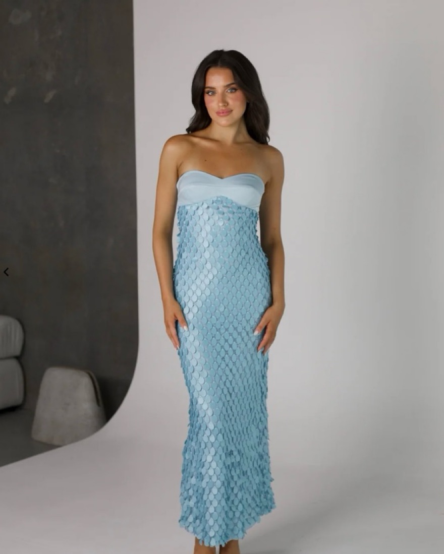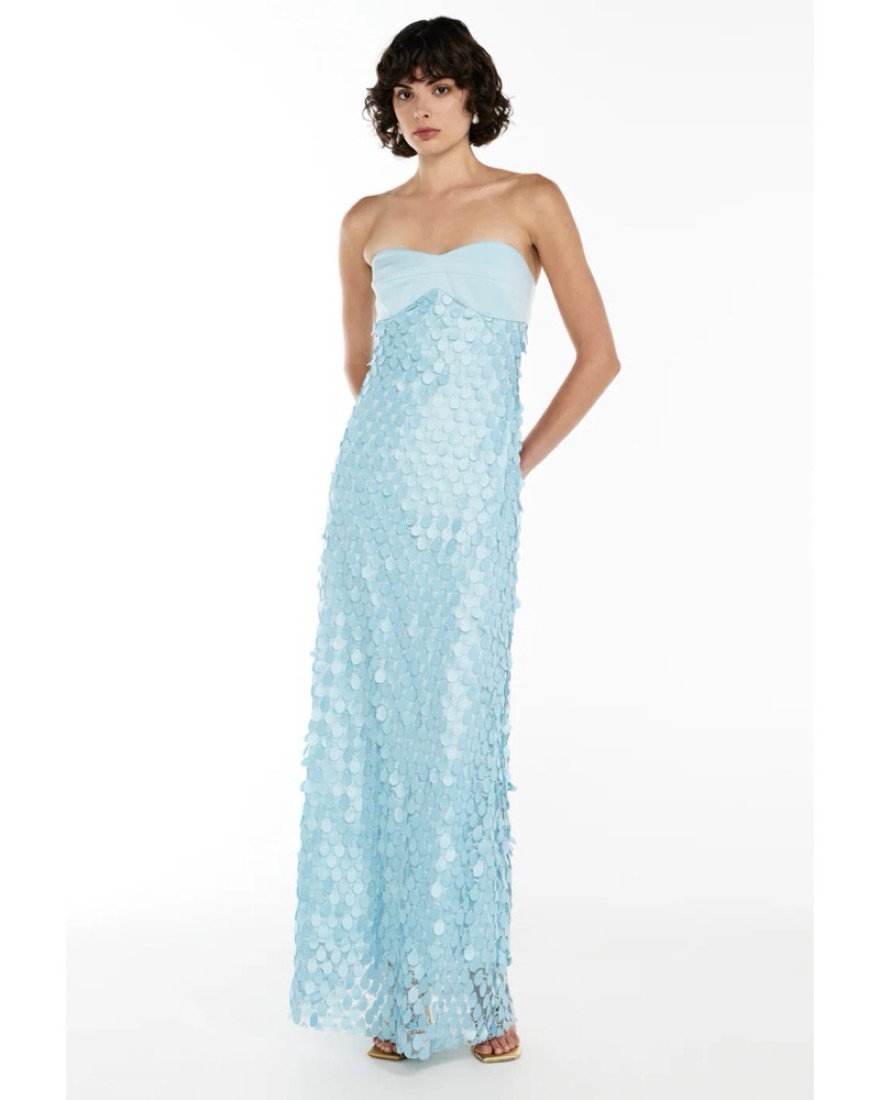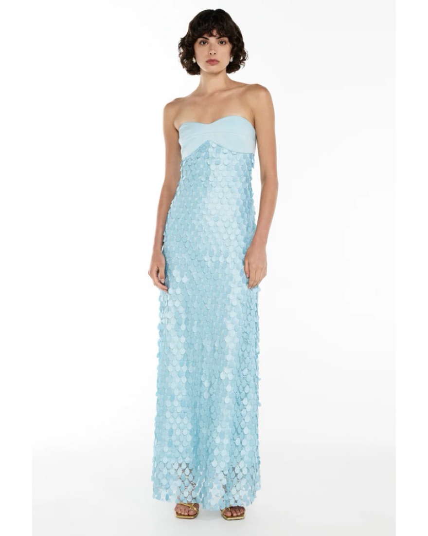 New season! Manning Cartell Supreme Extreme Balconette Dress. Size AU 8/US 4 or size small - model is wearing this size. True to size. tags: sequin dress, manning cartell, arcina ori, disc dress, blue wedding guest dress, viral, sequins, blue dress, blue cocktail dress, blue midi dress., prom