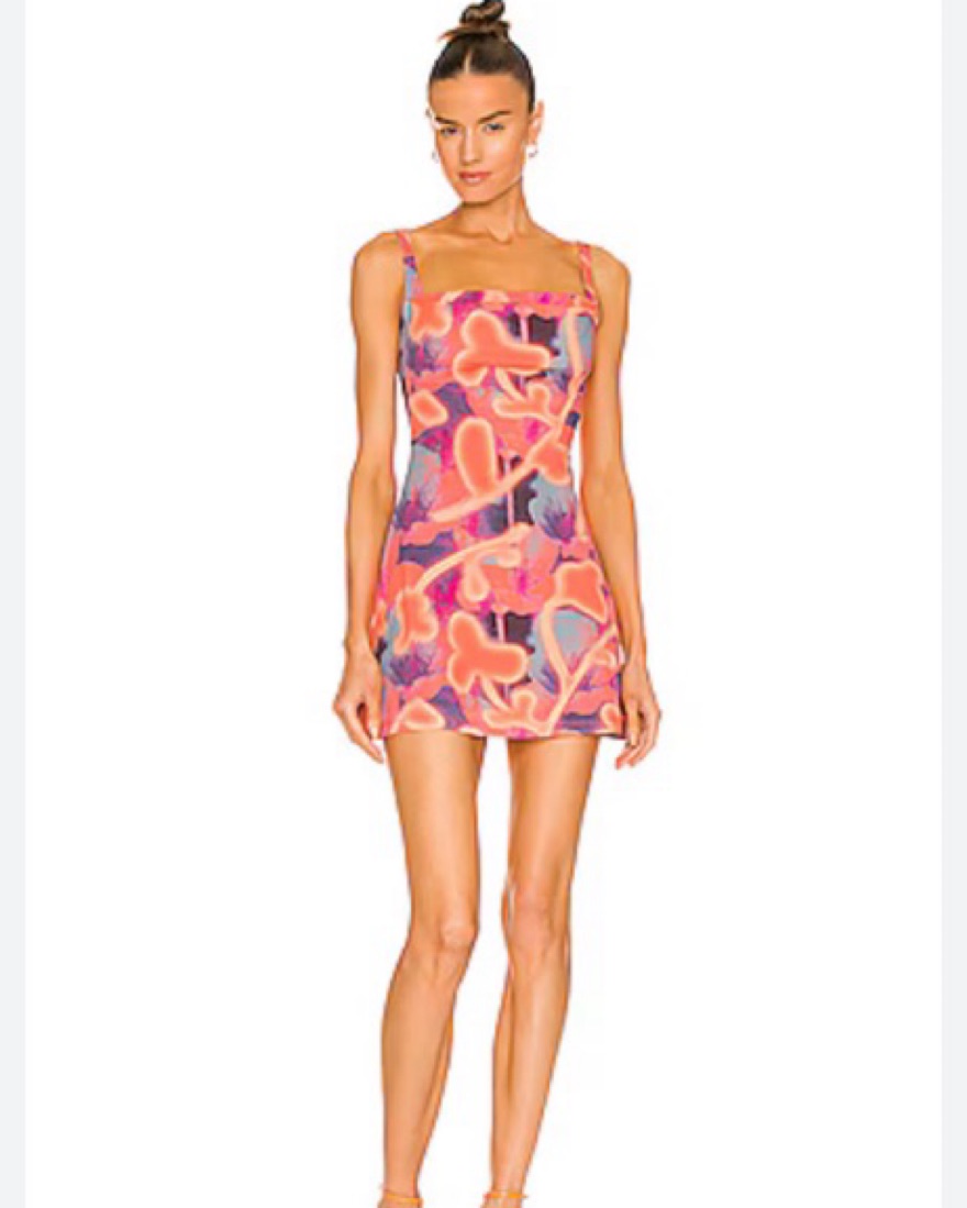 This playful mini dress in a vibrant floral print is perfect for a summer party or casual date night.