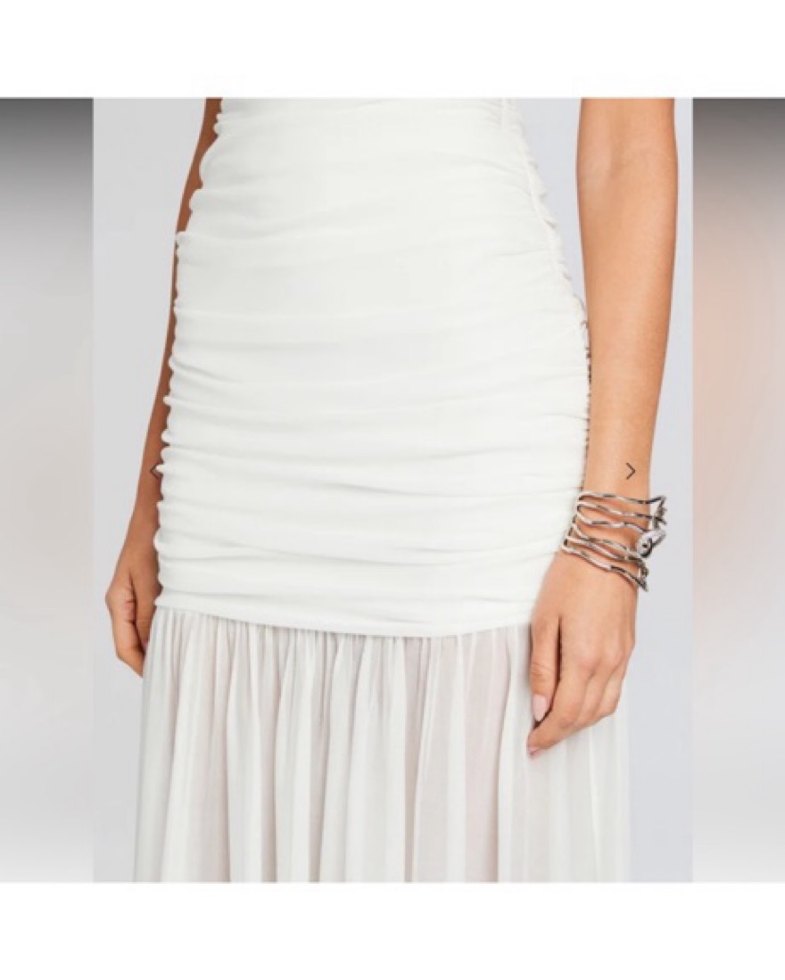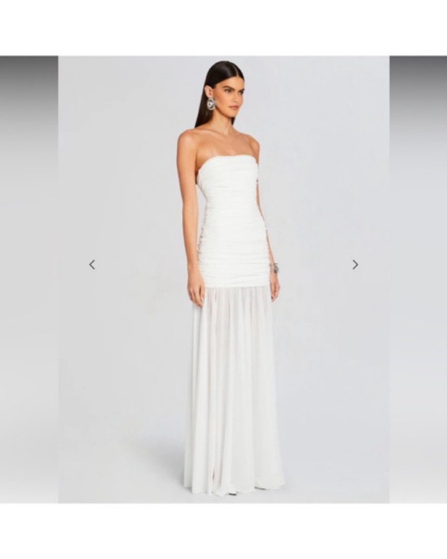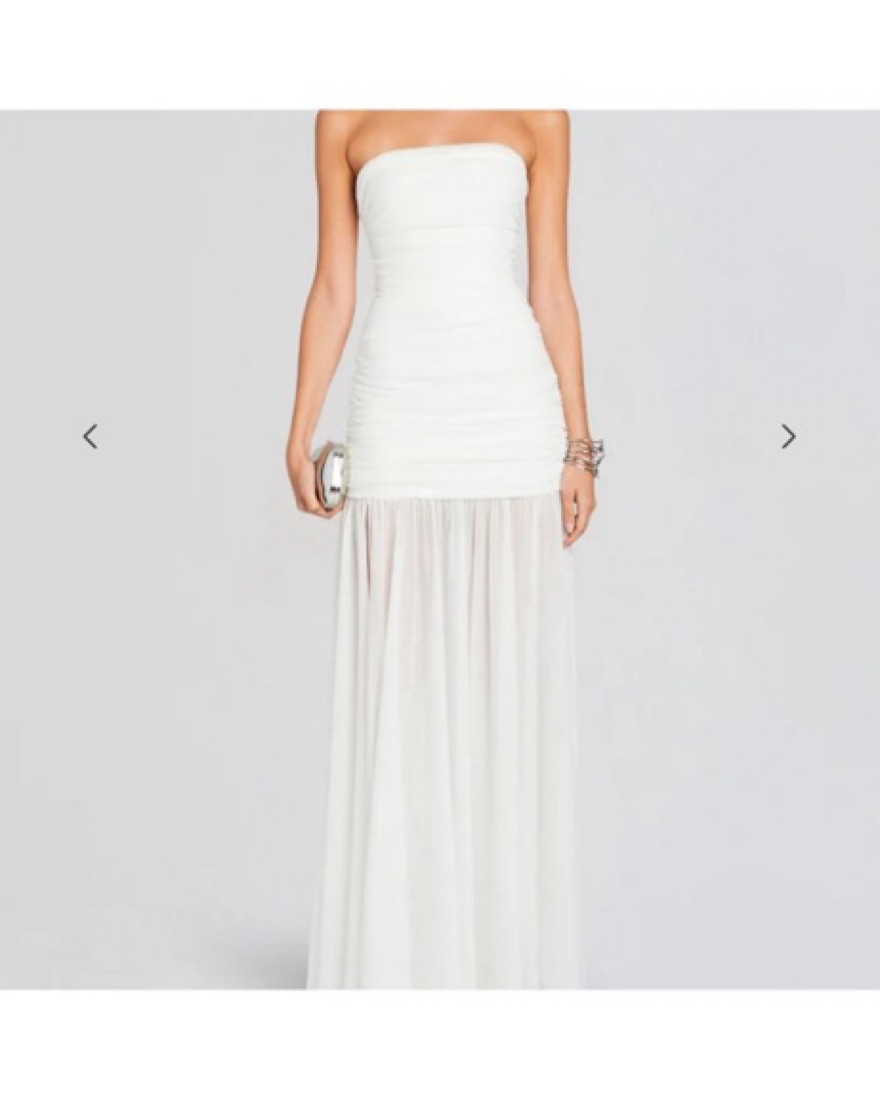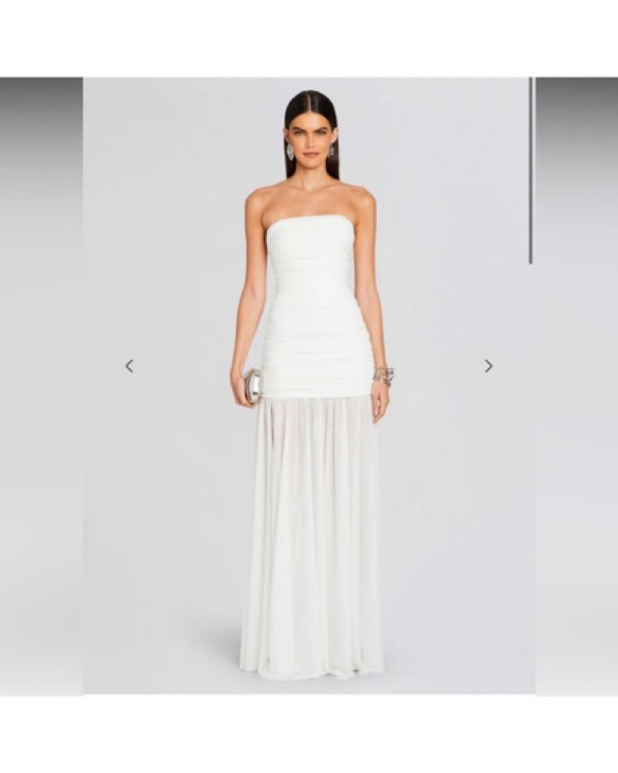 Perfect for summer events or the contemporary bride seeking a touch of modern elegance on her special day! Featuring strapless silhouette with sheer detailing this dress is truly stunning!! Worn once for a wedding event and dry cleaned.
