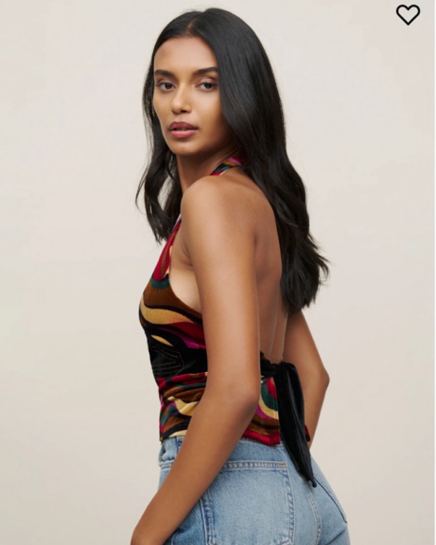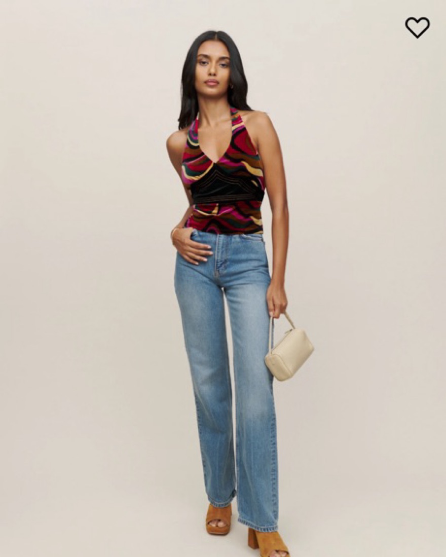 This bold and stylish outfit is perfect for a night out on the town or a summer festival. The vibrant strappy top adds a touch of glamour, while the high-rise jeans create a flattering and comfortable look.