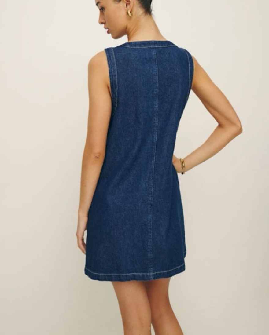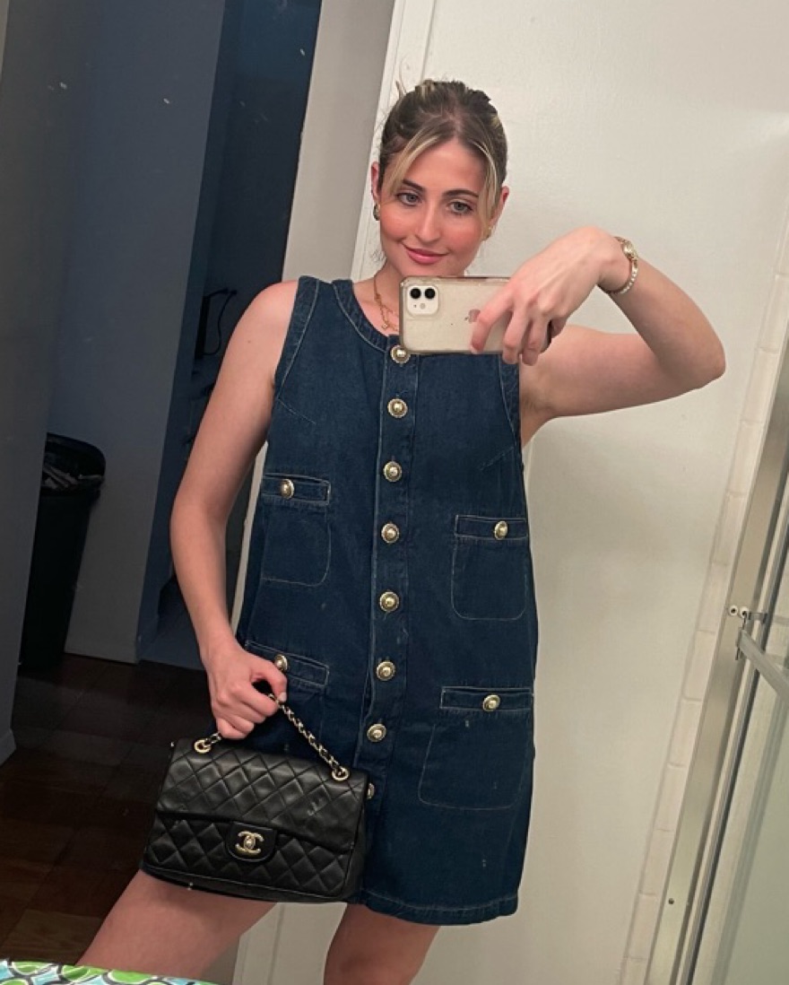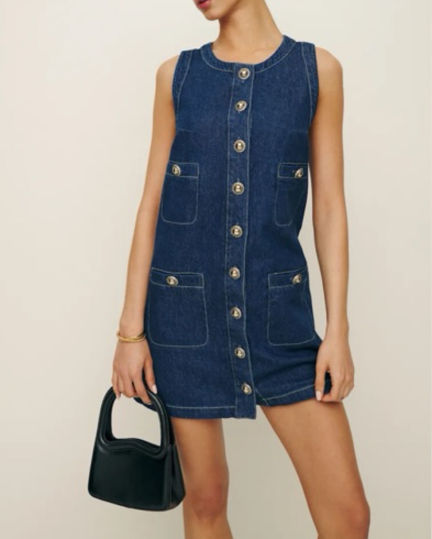 This dress is so unique and I get so many compliments when I wear it. I have worn it twice, it is a denim mini dress with gold button accents. I have it styled it a bit oversized which I think makes the look **