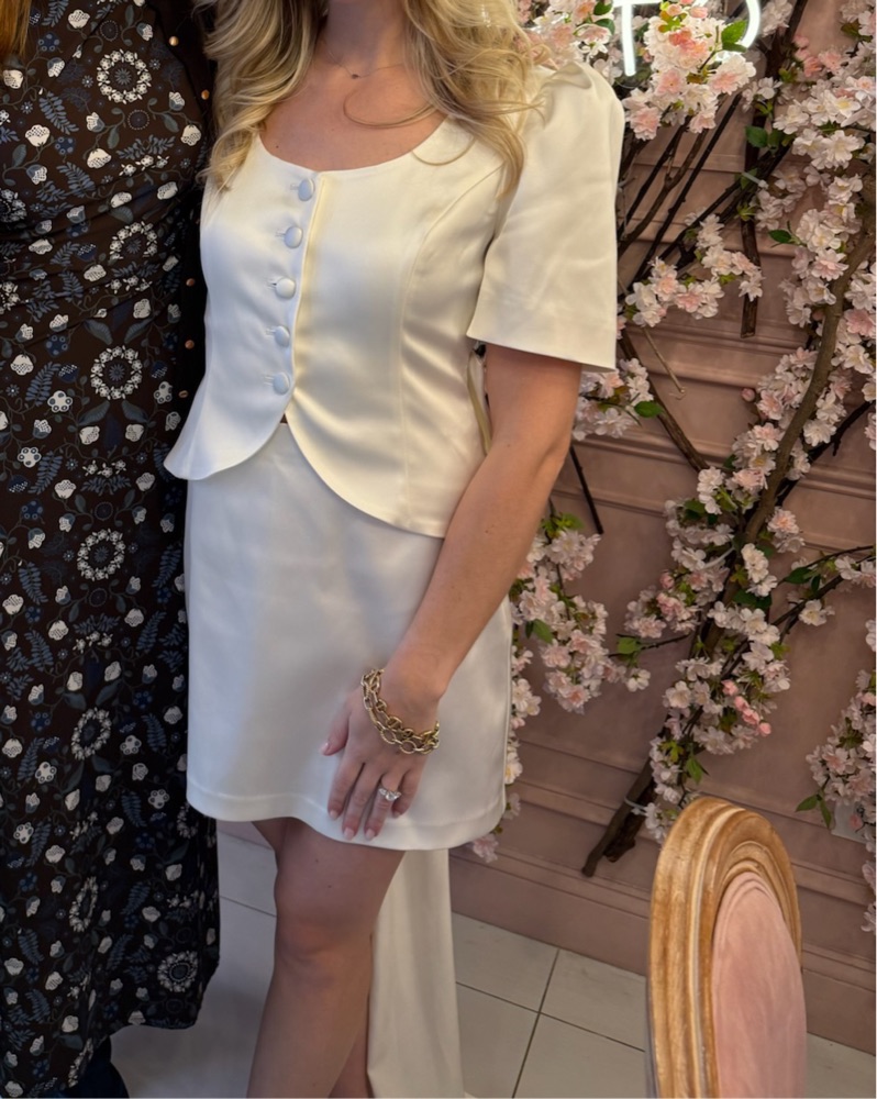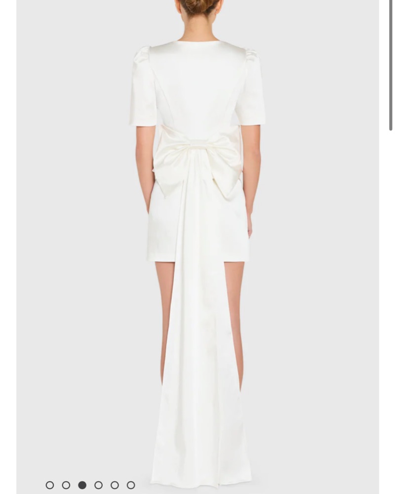 White two piece dress (but attached cannot be separated) with a bow on the back and a long bow tail amanda uprichard is the designer in perfect condition only wore once all sold out online. Cost more to dry clean and the price reflects that.