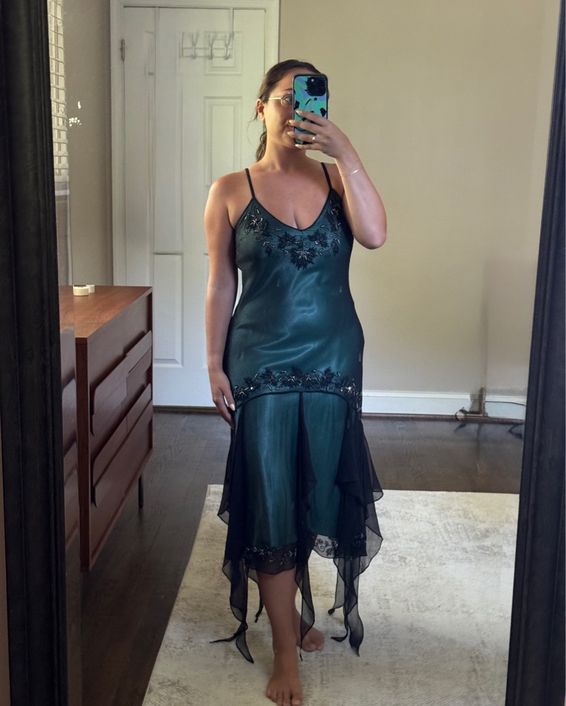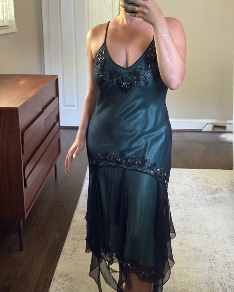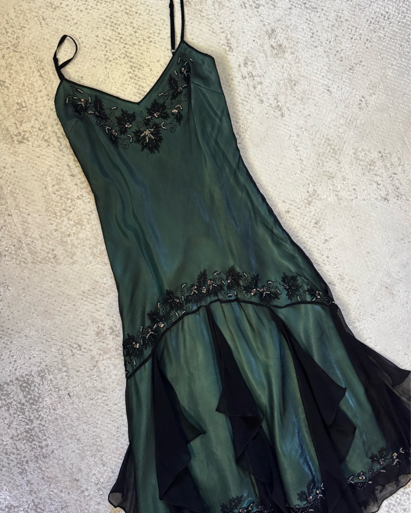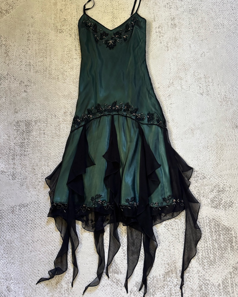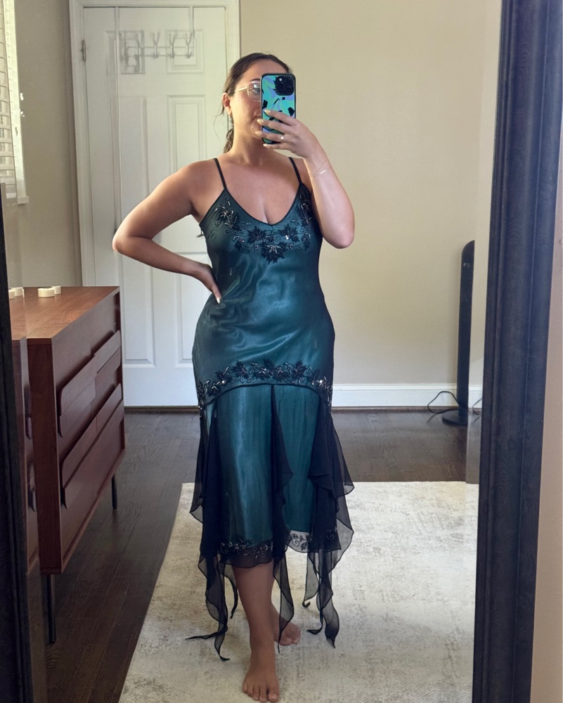 Vintage Adrianna Papell Evening blue green black silk mermaid/fairy dress. Size 10 but fits on the medium side and has adjustable straps. Thrifted it but pretty sure it’s from the 90s!!