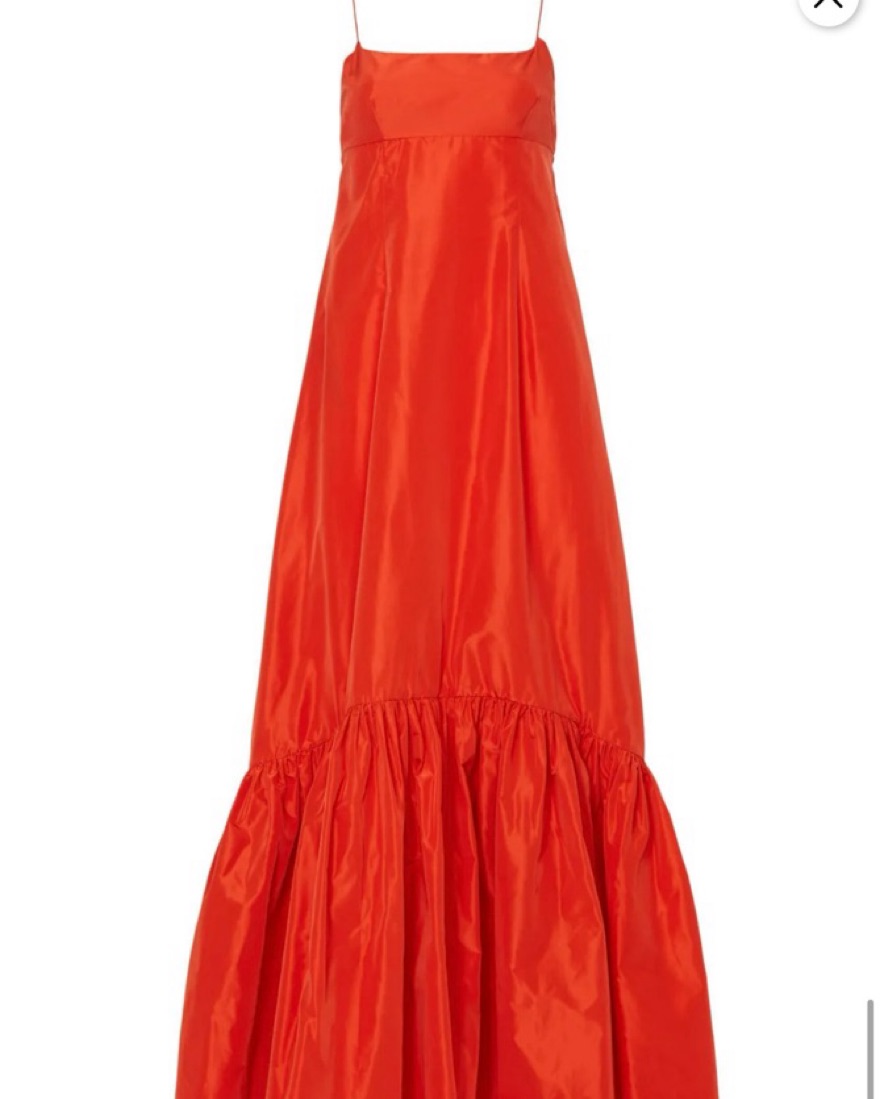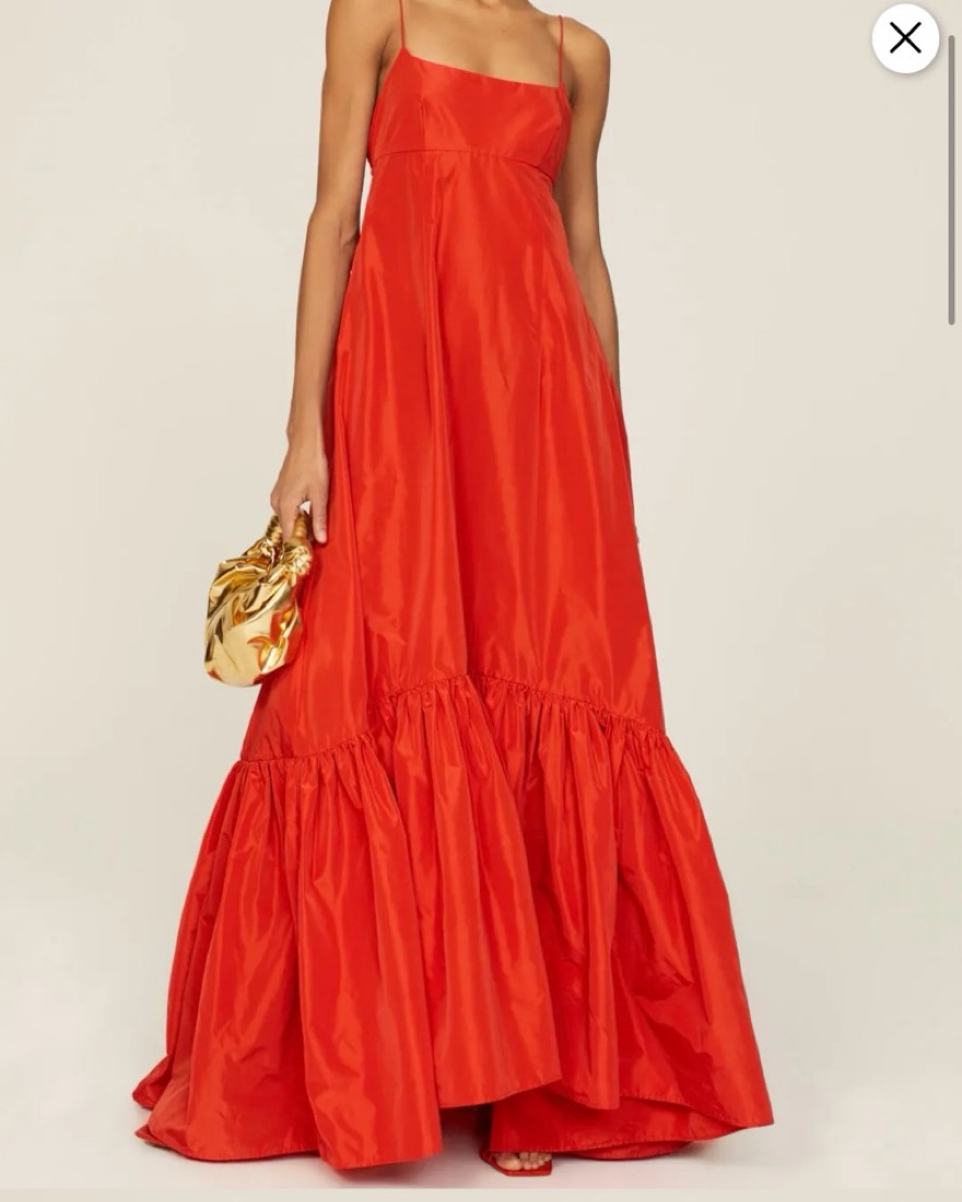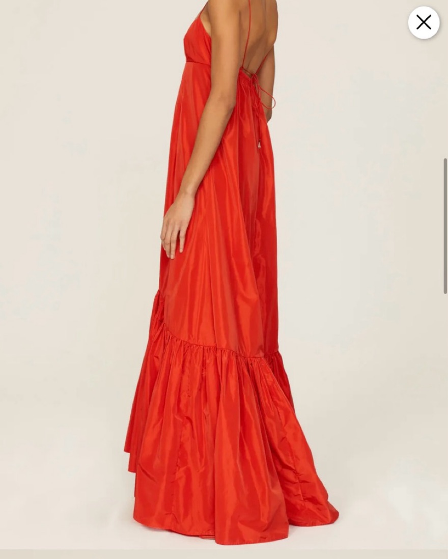 STAUD's 'Florence' gown is the perfect choice for events. Cut from crisp taffeta in a vibrant 'Hibiscus' hue, it features a fitted bodice and slender ties at the back. Elevate the sweeping tiered skirt with your favorite heels. (I got the bottom cut off a few inches because it was very long)