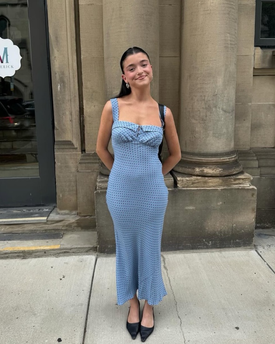 Super cute brand new reformation Tancy dress - blue with red polka dots