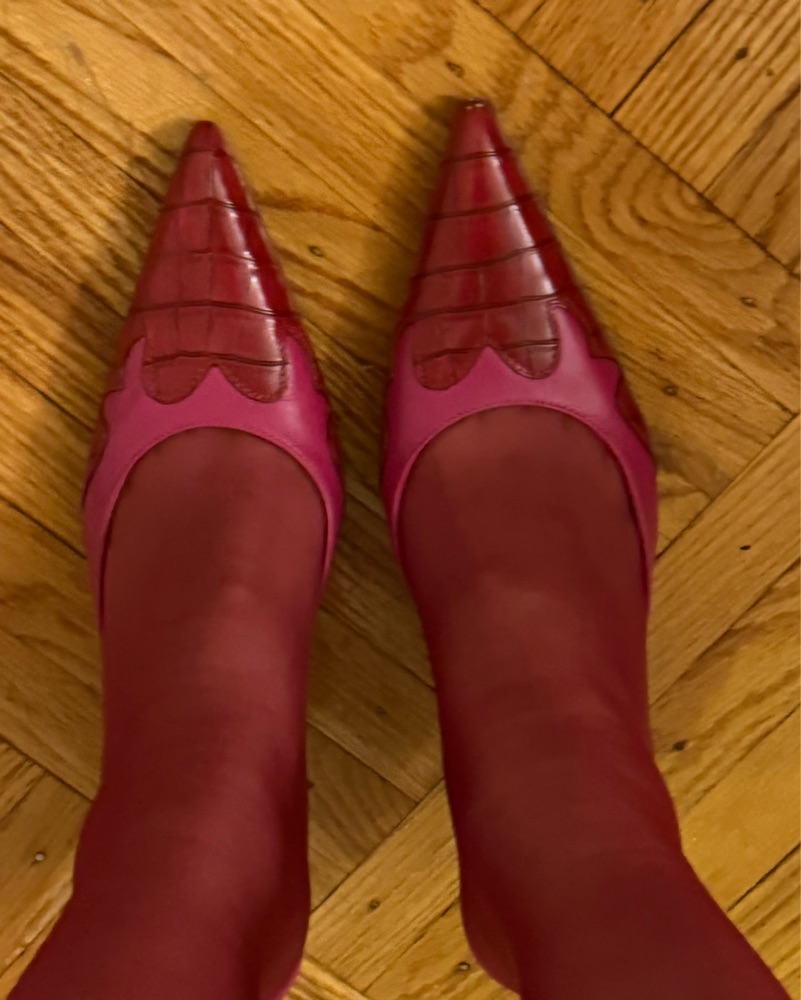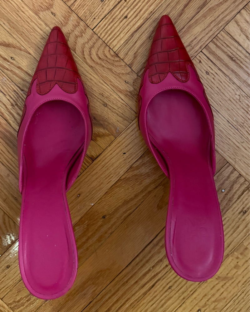 The most gorgeous pink and red leather 3.5 inch pumps with western-style detailing and snakeskin detail at the toe. Sold out online, perfect shoe to elevate any outfit. Size 39.5, best for 8 or 8.5!