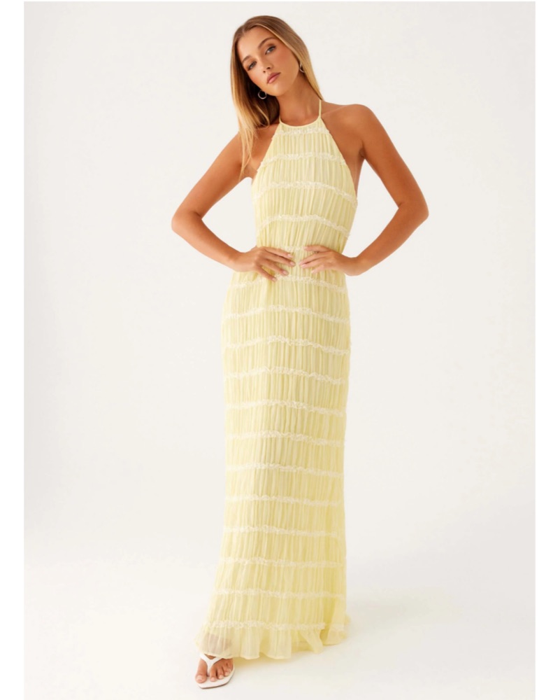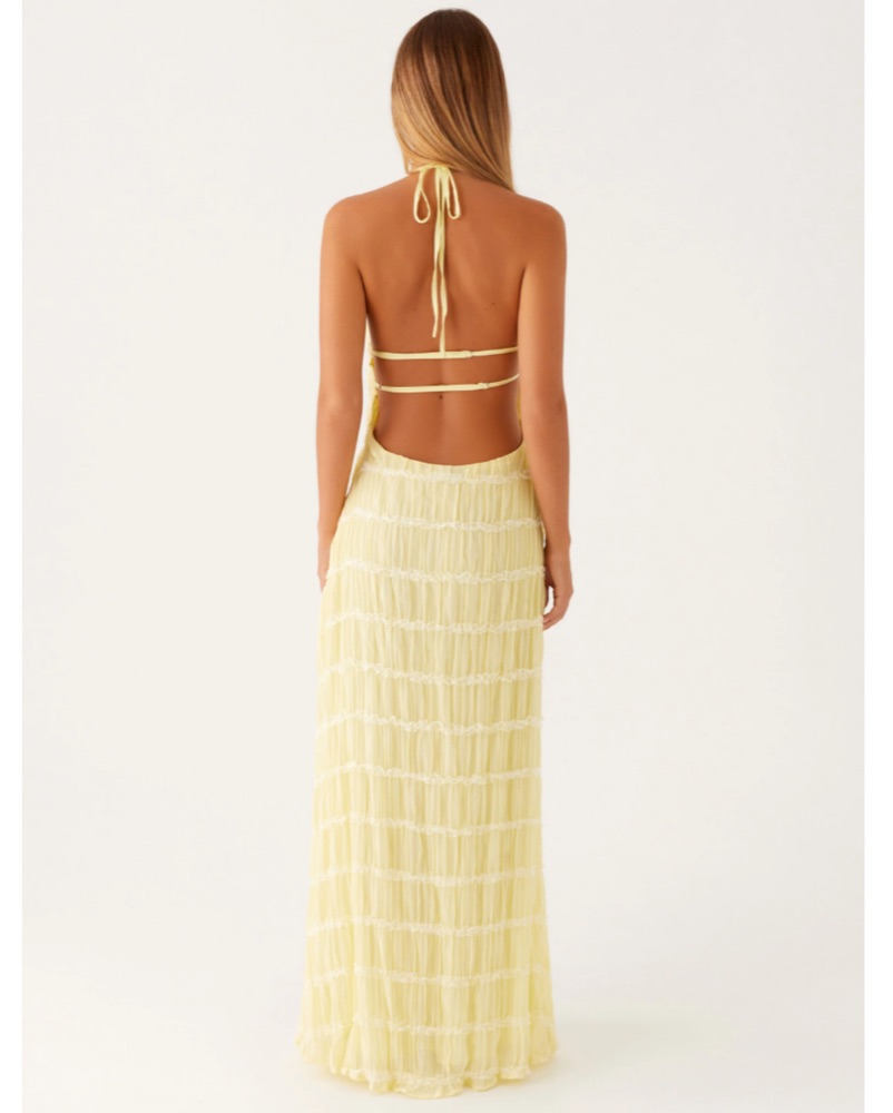 The Aullie Maxi Dress features a halter neckline, a neck tie for an adjustable fit, and a side hook and eye closure for added security. A perfect blend of elegance and sophistication.