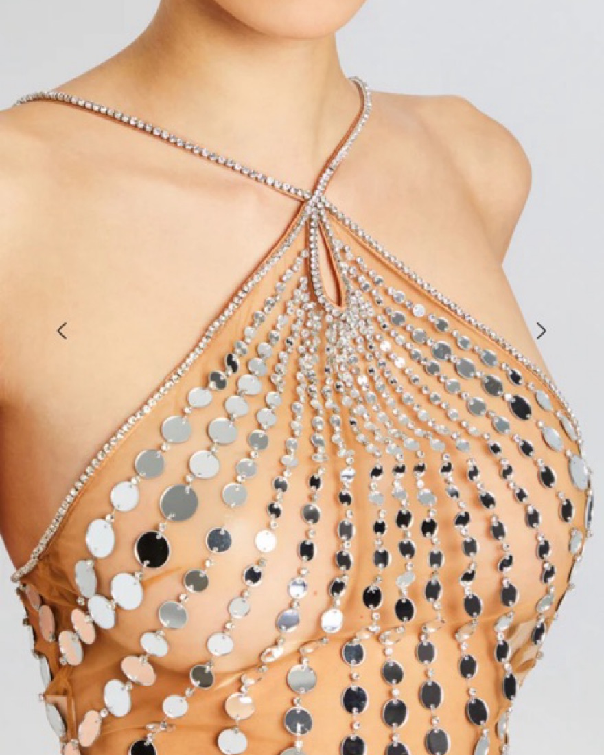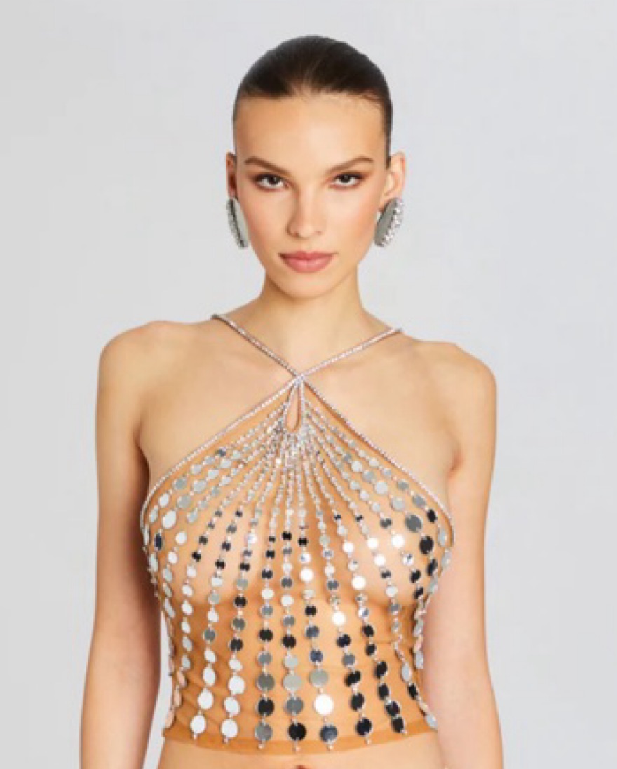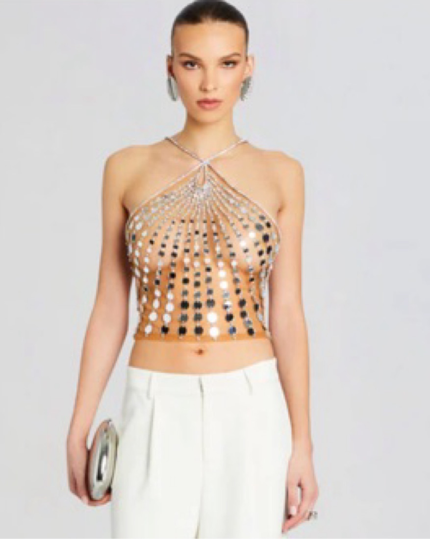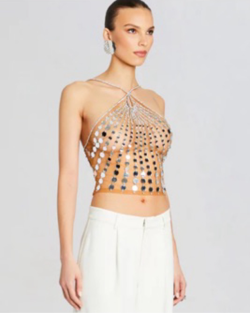 Mirrored plexi embellishments and hand-stitched glass crystals. Extremely delicate item. Adorned with embellishments, this top catches the light and adds sparkle to any ensemble. Perfect for both casual outings and special occasions.