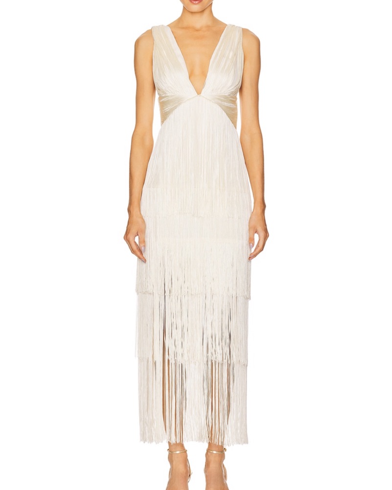 Skylar Maxi Dress in Ivory by Michael Costello. Twirly and fun fringe moves and sways as you walk, with a sexy, feminine silhouette. Perfect for rehearsal dinner or bridal event!