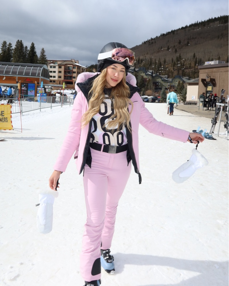 This cheerful ski outfit is perfect for hitting the slopes in style. The bright pink color and retro-inspired pattern add a fun, fashionable touch to your winter wardrobe. Jacket, pants and mid layer