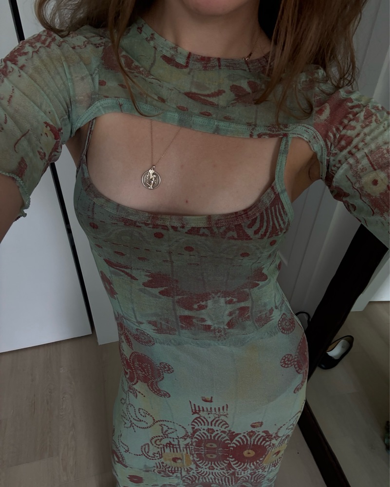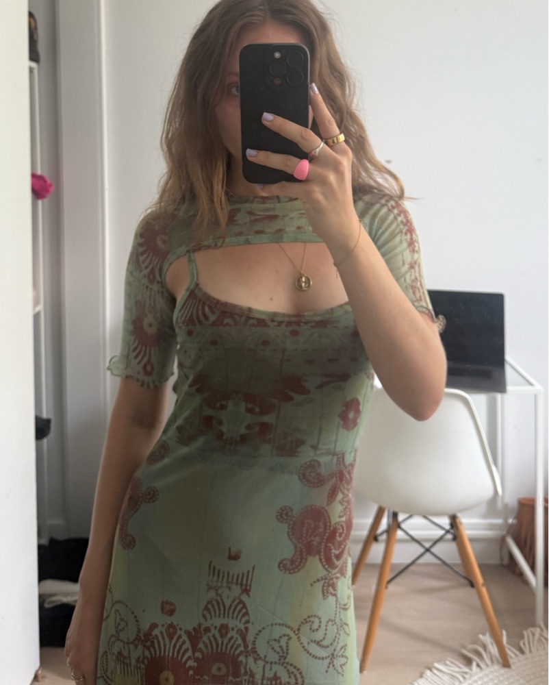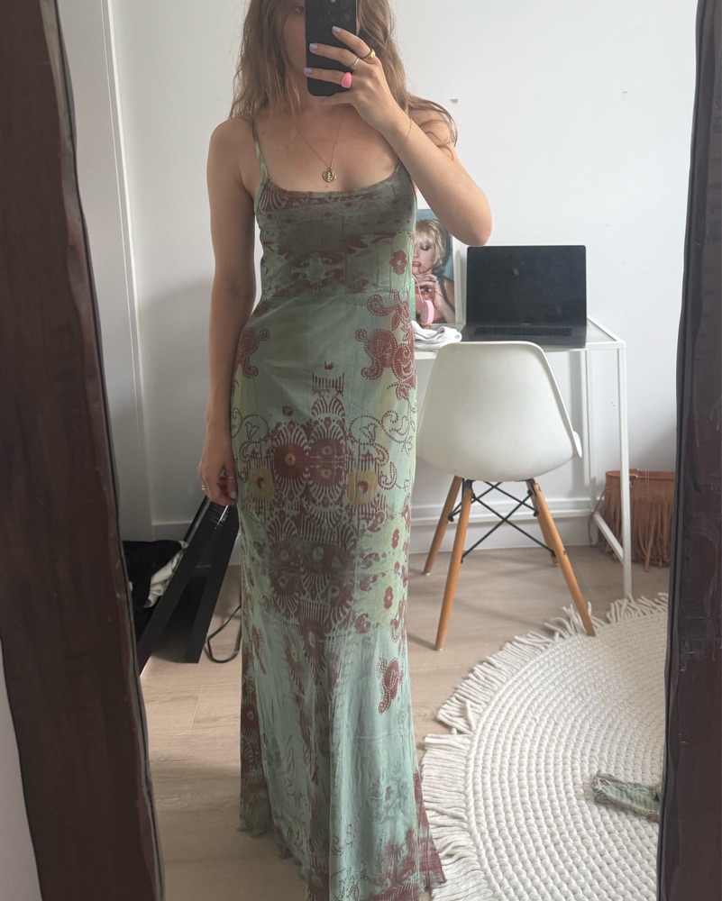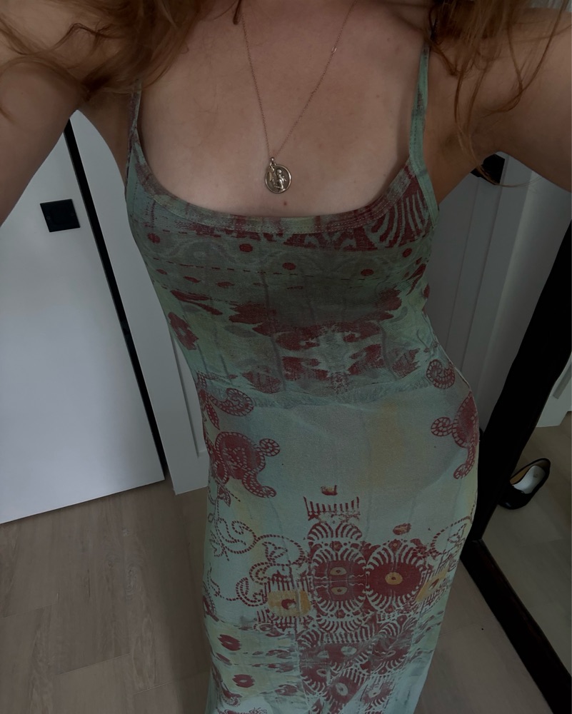 Size small. Vintage Legatte Jeans (used to be God Save the Queen). Super flattering! I’m 5’6 and it hits right at the floor without shoes. So obsessed w this dress