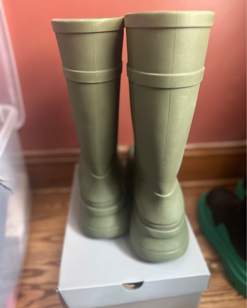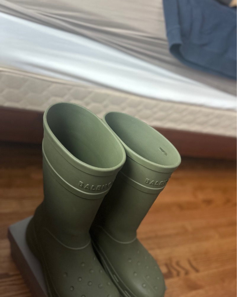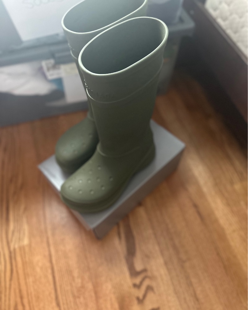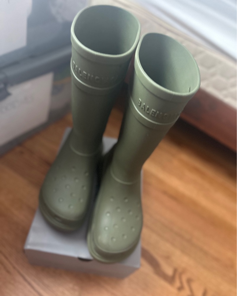 I’m renting out my olive green Balenciaga Croc rain boots — bold, eye-catching, and impossible to ignore. Perfect for festivals, fashion week, photoshoots, or if you’re just in the mood to turn heads in the rain.