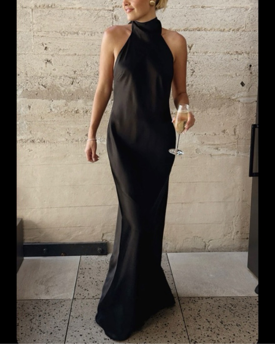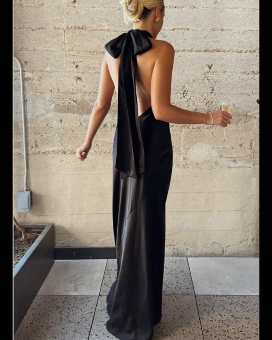 Black Luxe Satin. Worn once for a wedding. I am 5’8” for reference in the photos and had on heels. Super comfortable! **delicate item - I will dry clean this once returned**