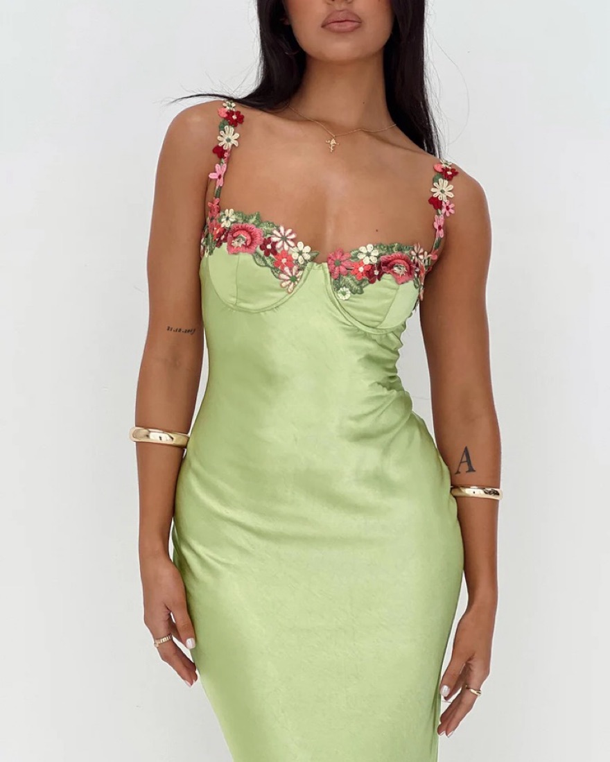 Maxi dress 100% polyester Silky material Floral embellishments Adjustable shoulder straps Wire cups Invisible zip fastening at back Non-stretch Lined bust