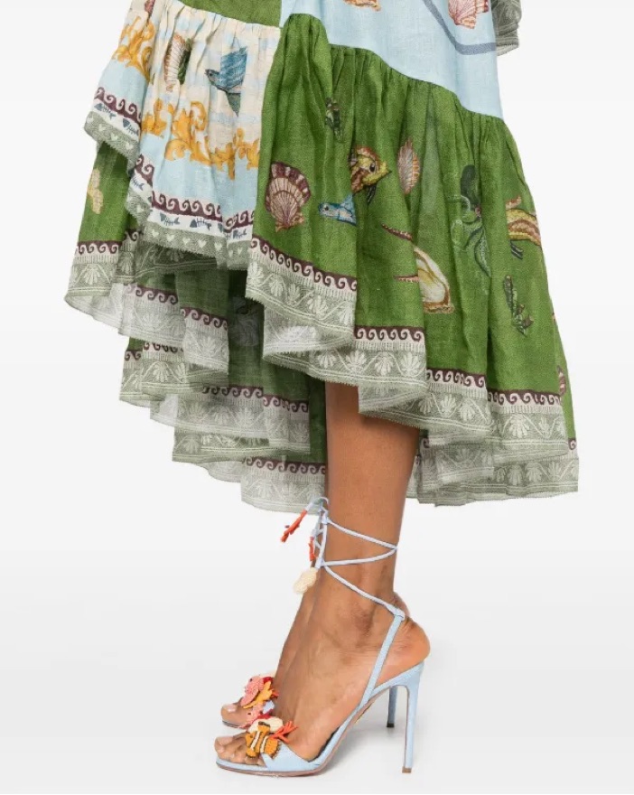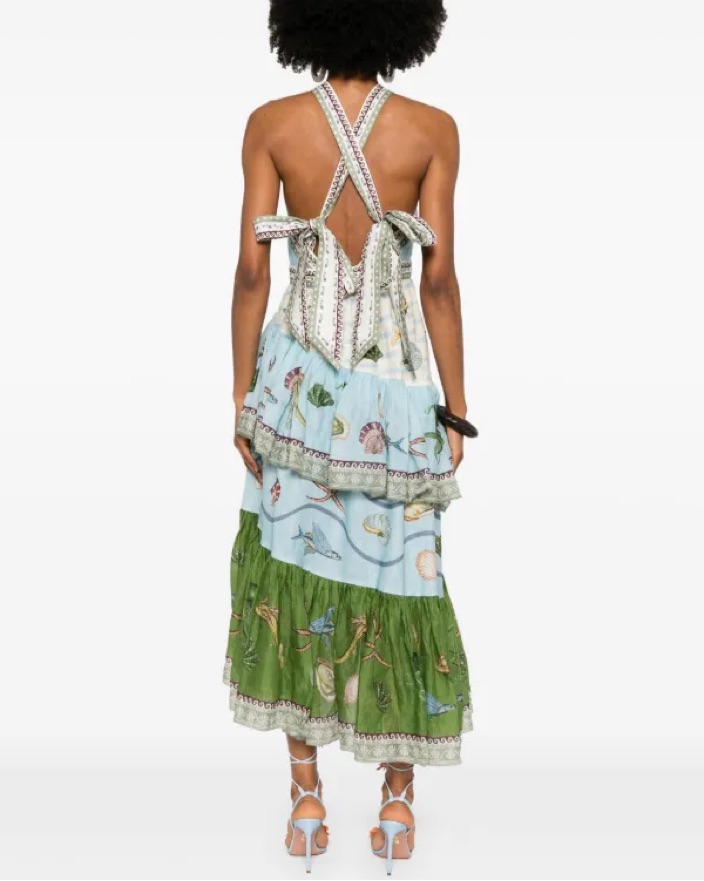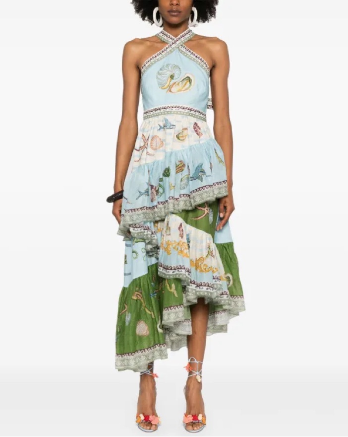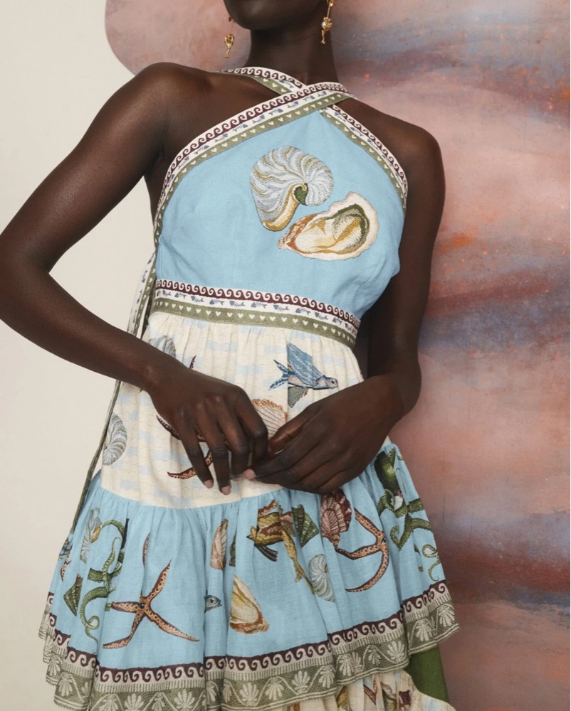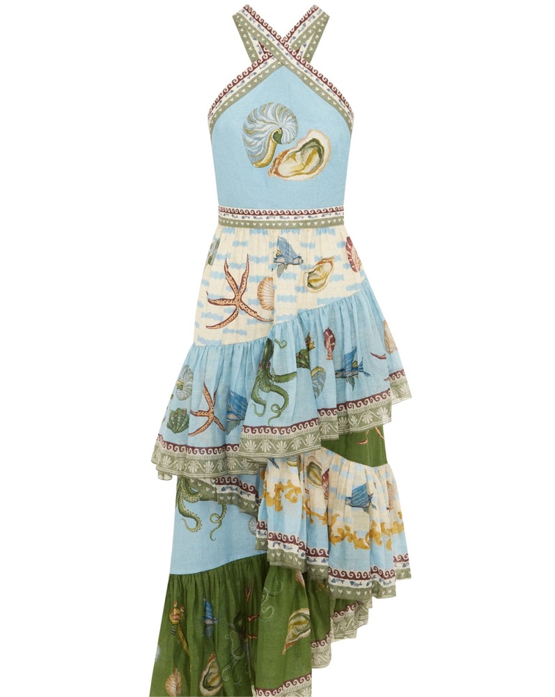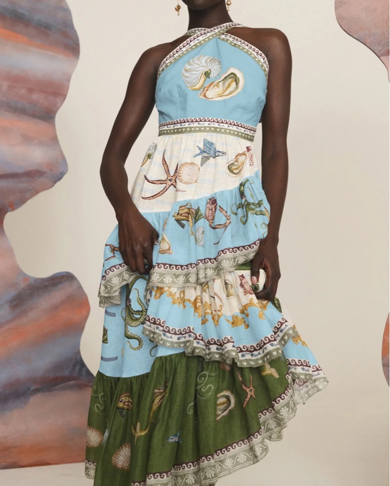 Size AU 10/US 6! Gorgeous halter neck with self-tie back — allows for a bunch of different configurations! Fun sea life print and ruffled skirt. Zip at center back of skirt. Hasn’t been worn yet other than me trying it on!