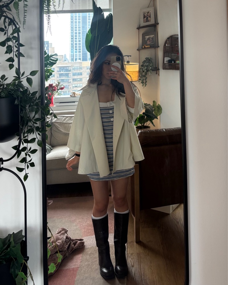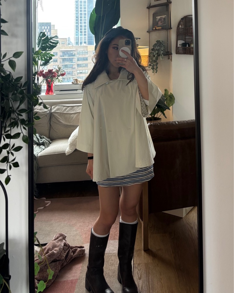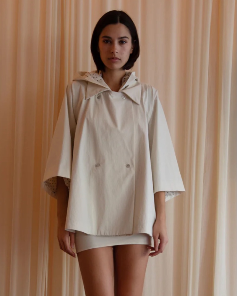 ADORABLE raincoat 🤌🏼 tried it on in the store and I INSTANTLY fell in love with it! Makes you feel a little whimsical in the best way. Currently sold out on their website in this size. Marked an XS/S. Fits true to size + has a hood too! Styled w/fait par foutch Mia dress (also renting)