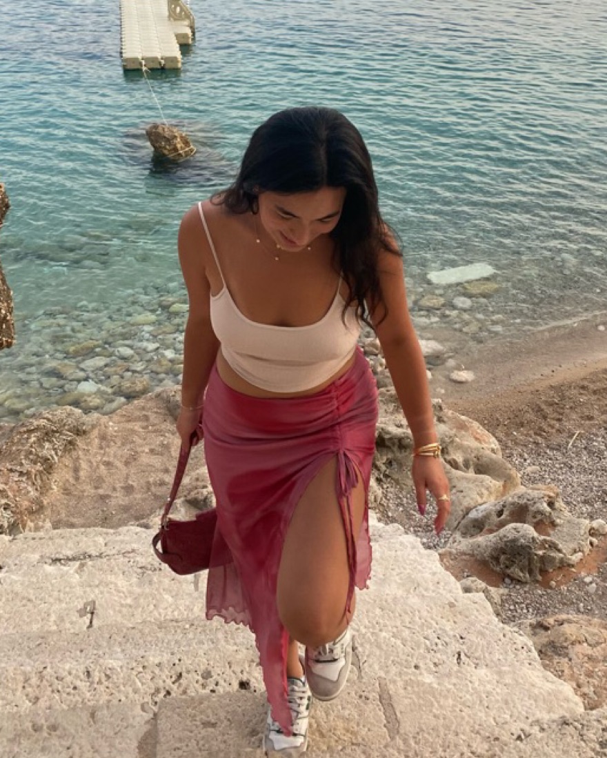 Stretchy pink skirt with a slit up the left side