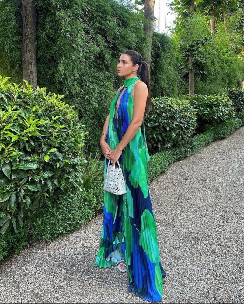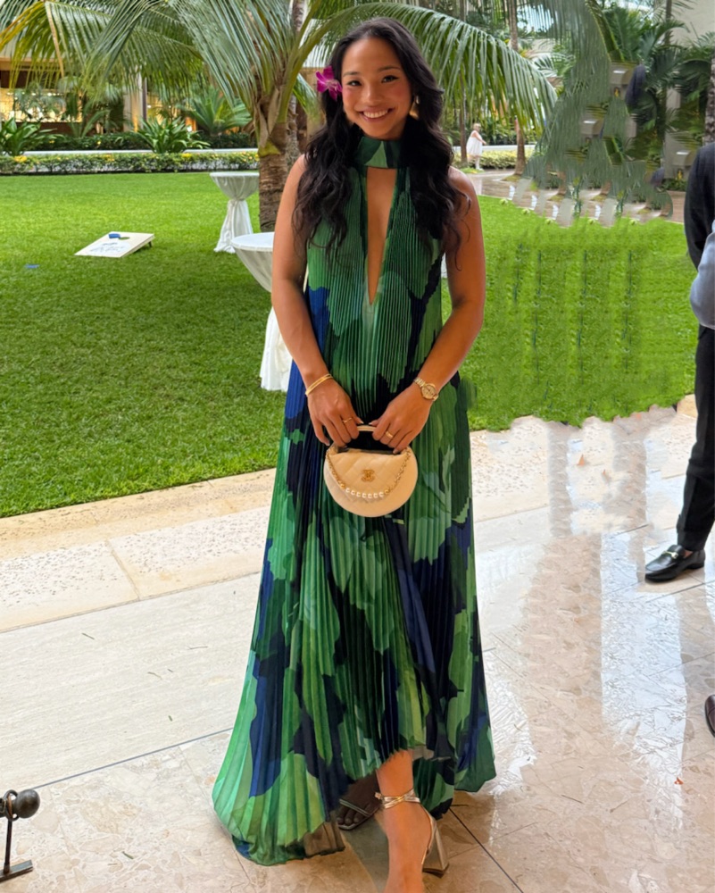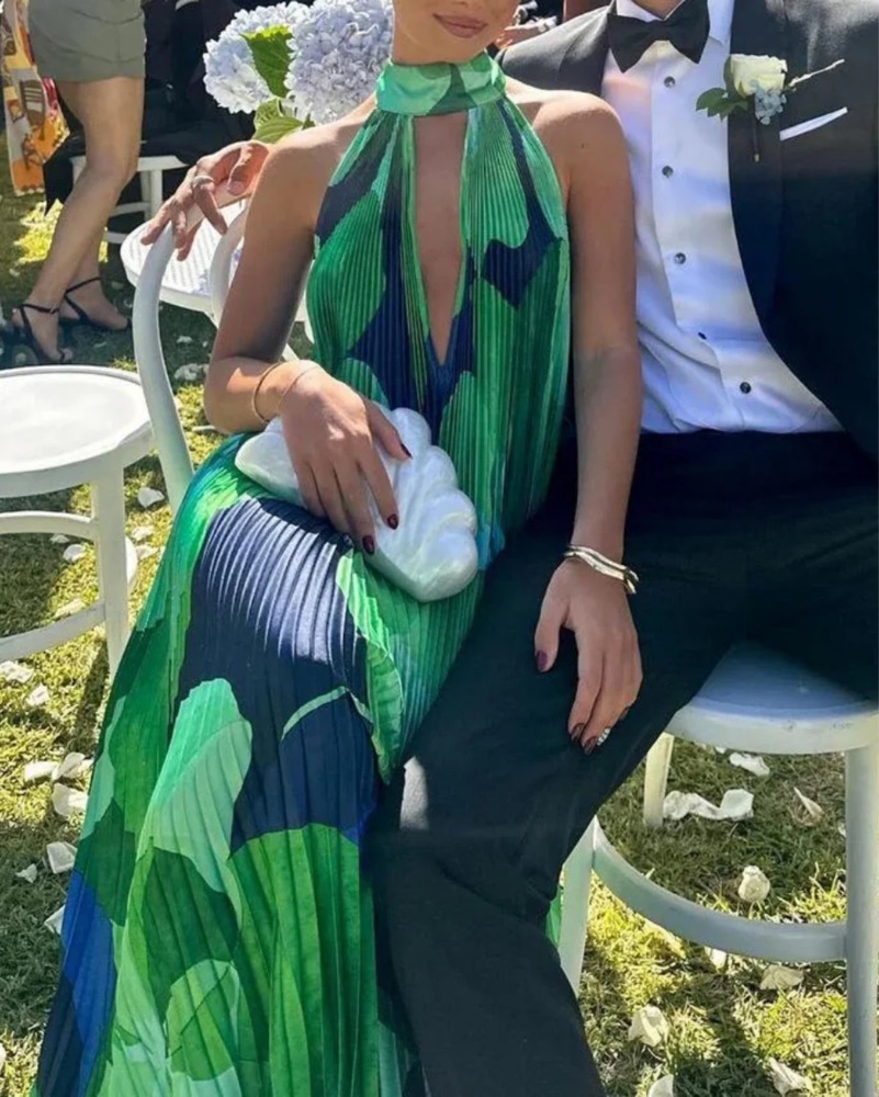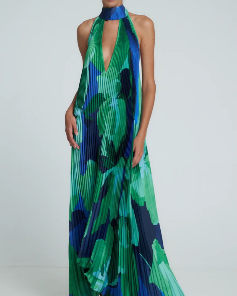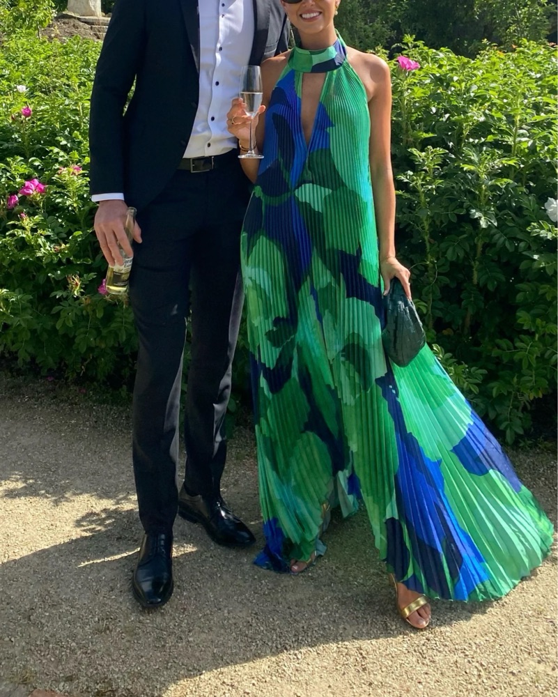 The most stunning dress! Perfect for black tie weddings. Dress is flowy and has adjustable neck tie so fits anywhere from XS-M. Bag is also available for rent. Please dry clean before returning!