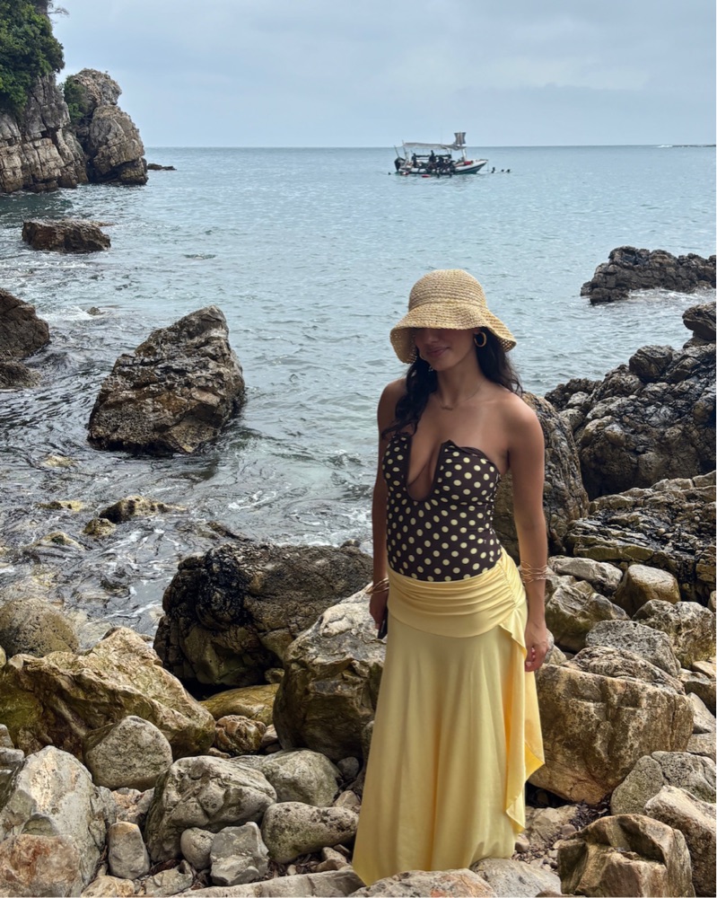 Brown and yellow polka dot one piece , so flattering and on pre order rn! Can wear as a bathing suit or body suit