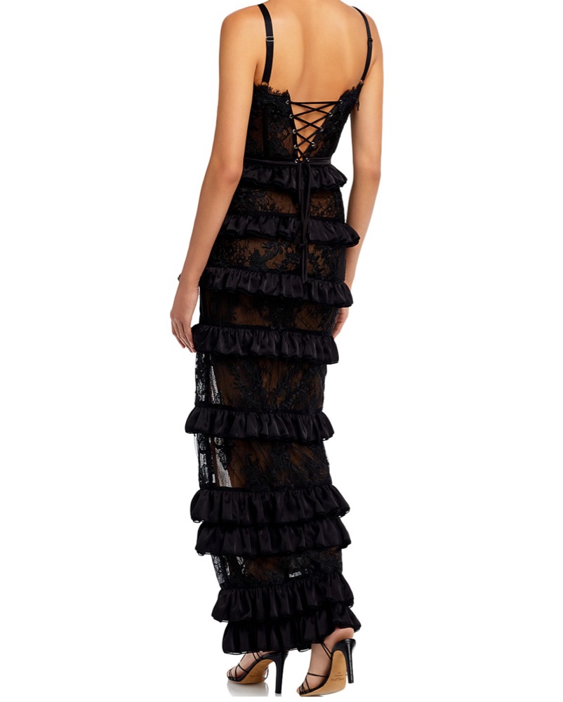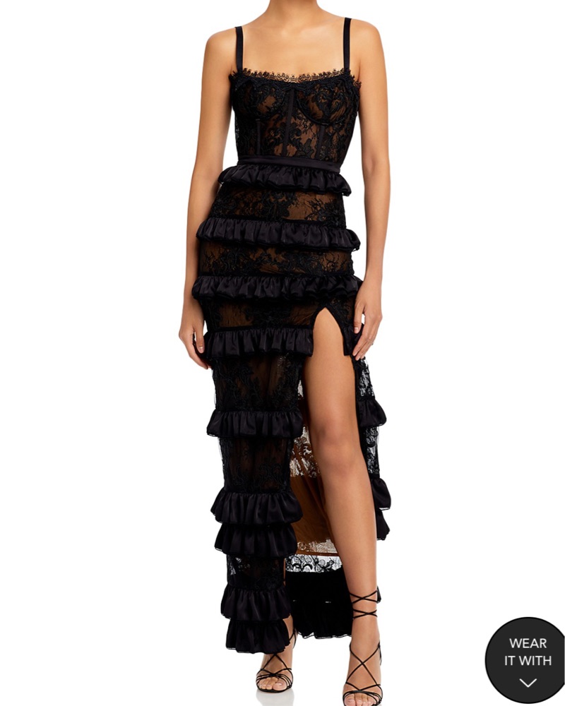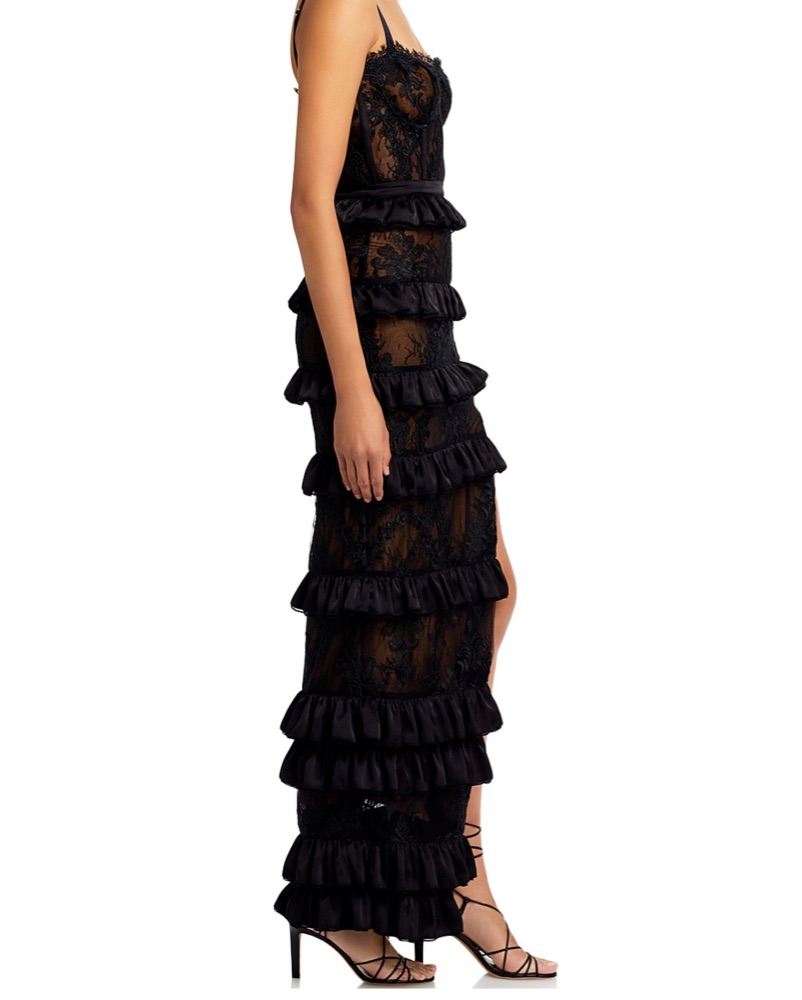 This stunning lace maxi dress features a figure-flattering silhouette and dramatic ruffled detailing and a high leg slit. Worn only one time as a wedding guest.