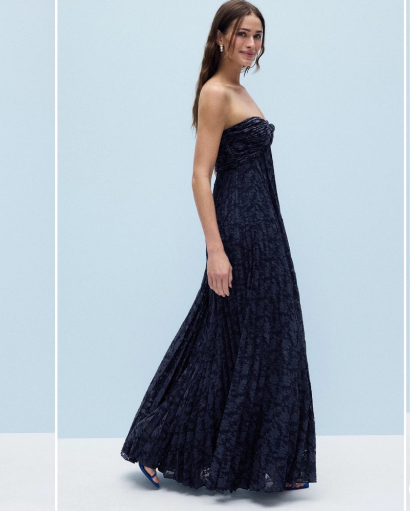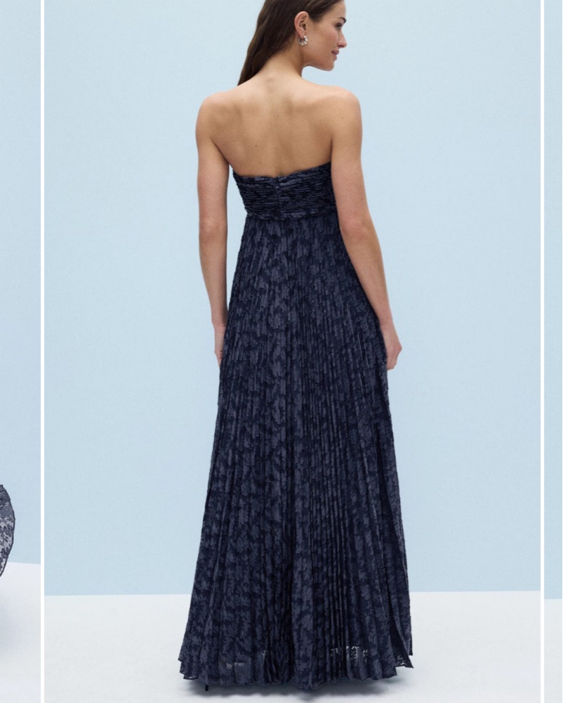 Strapless, floor length gown with a pleated skirt and twisted bodice. Note, dress is long so requires higher heels for short girls!