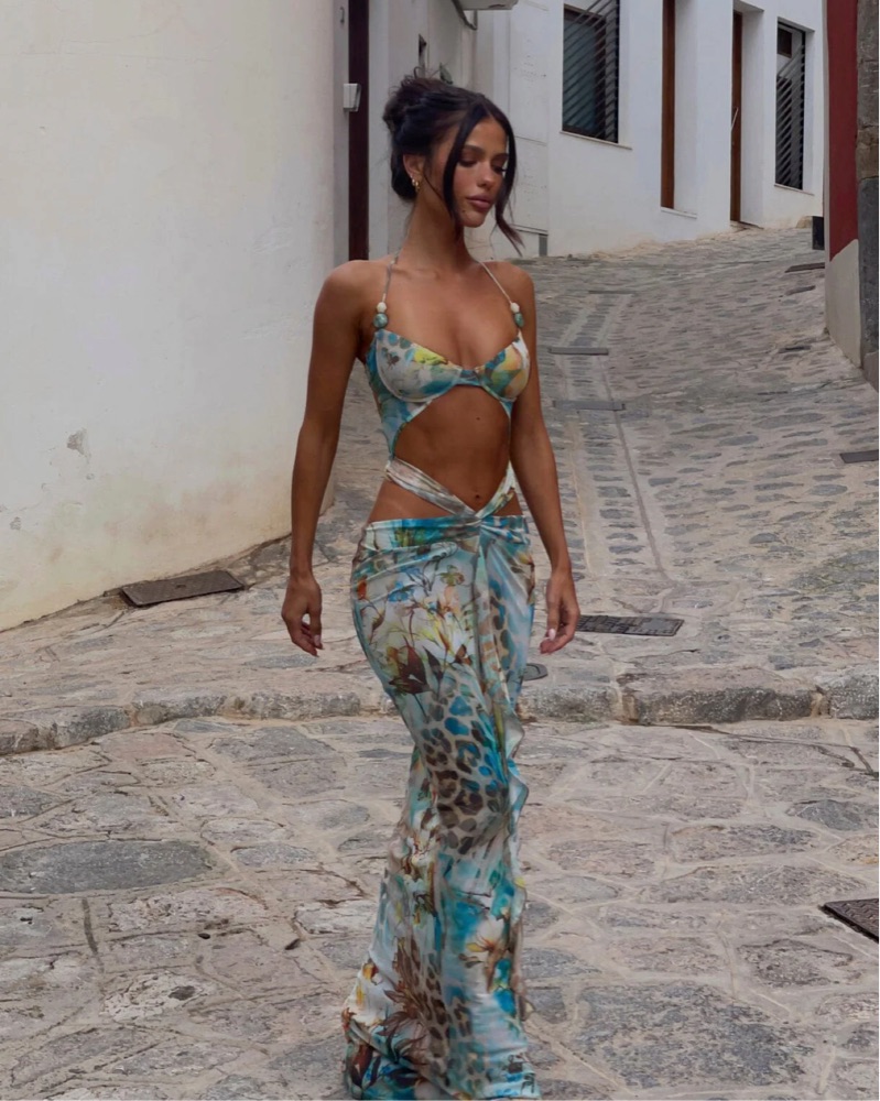 Outcast Meilani Maxi Dress in Amazonia print. Bodycon fit with halter neckline, underwire bust, and flattering cut-outs. Features a low-rise waist, high slit, and backless tie design. Perfect for vacations, events, or nights out ✨Perfect condition, only worn once!