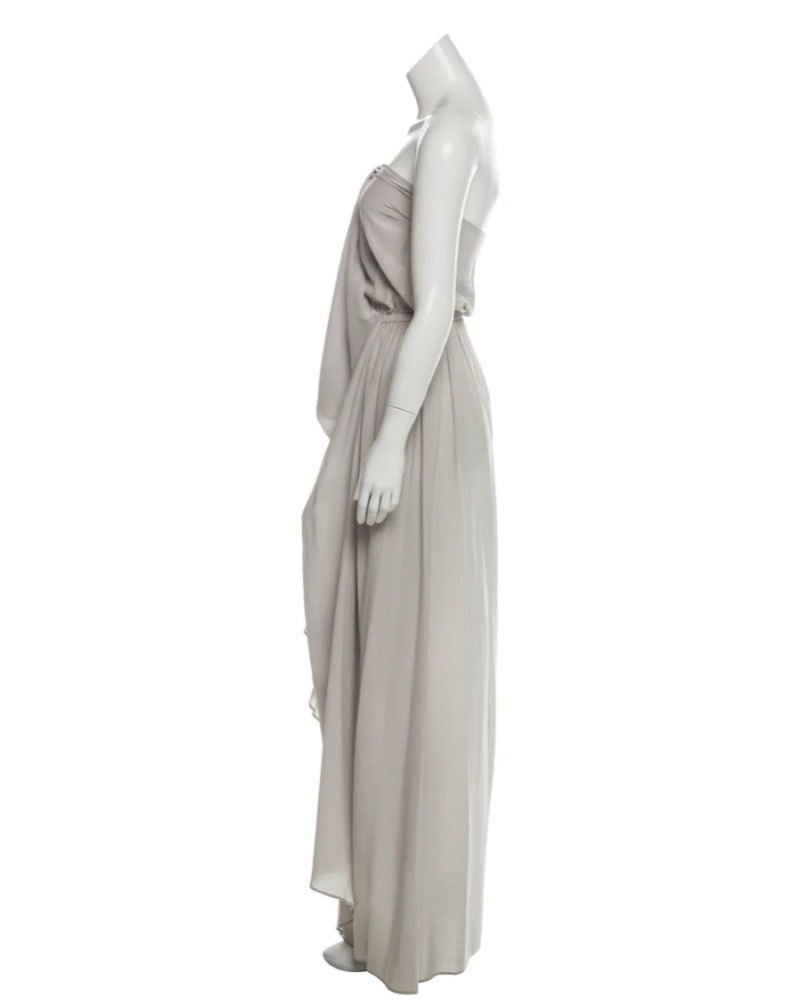 Heather grey Zimmermann silk strapless dress with boning at bust, draped overlay at front and concealed zip closure at side. Designer size 0.