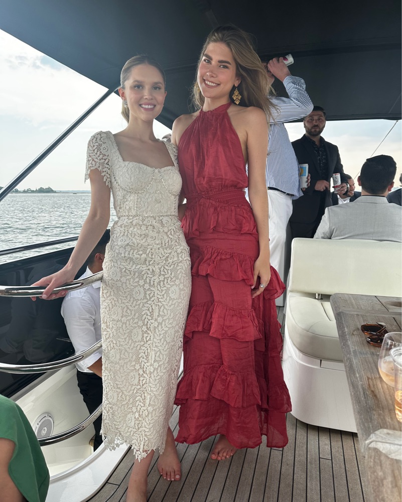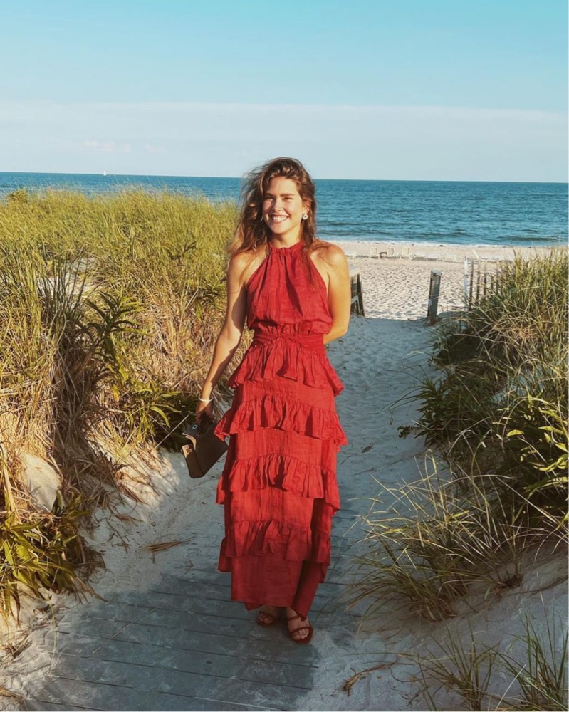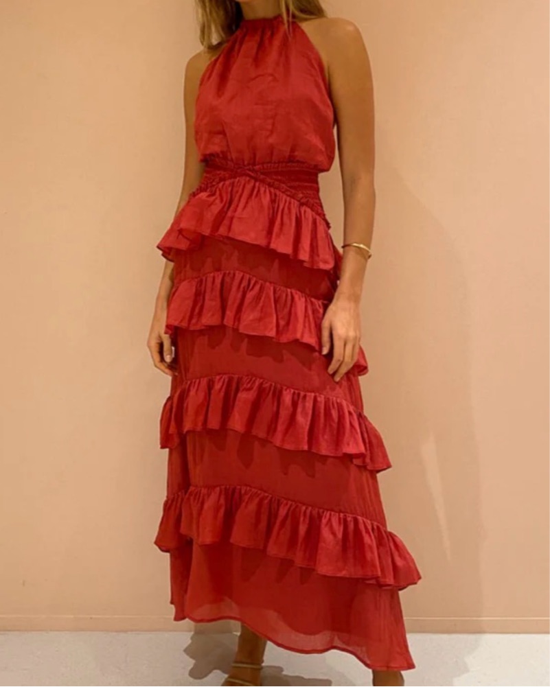 This vibrant red tiered maxi dress is perfect for a summer wedding or formal event. The ruffled tiers create an elegant, feminine silhouette.