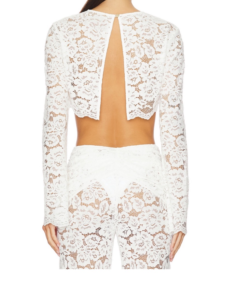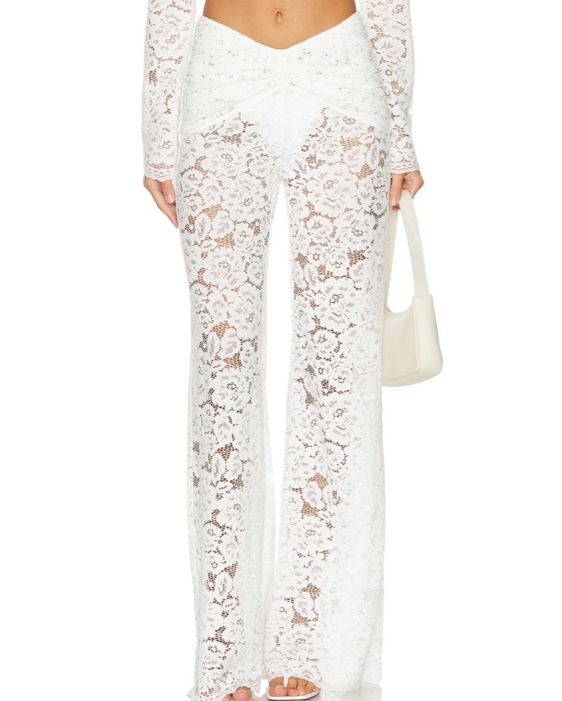 This stunning lace ensemble is perfect for bathing suit cover up / resort wear attire. The cropped top and wide-leg pants create a chic and sophisticated look.
