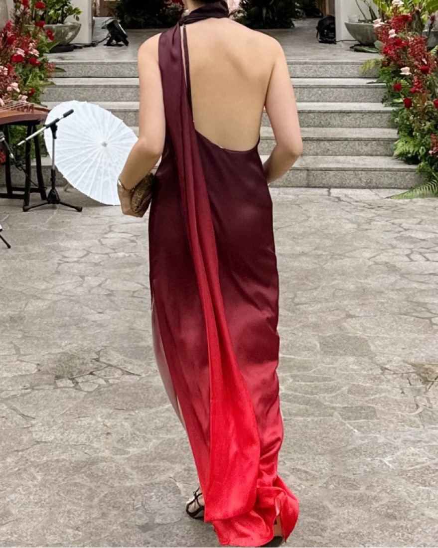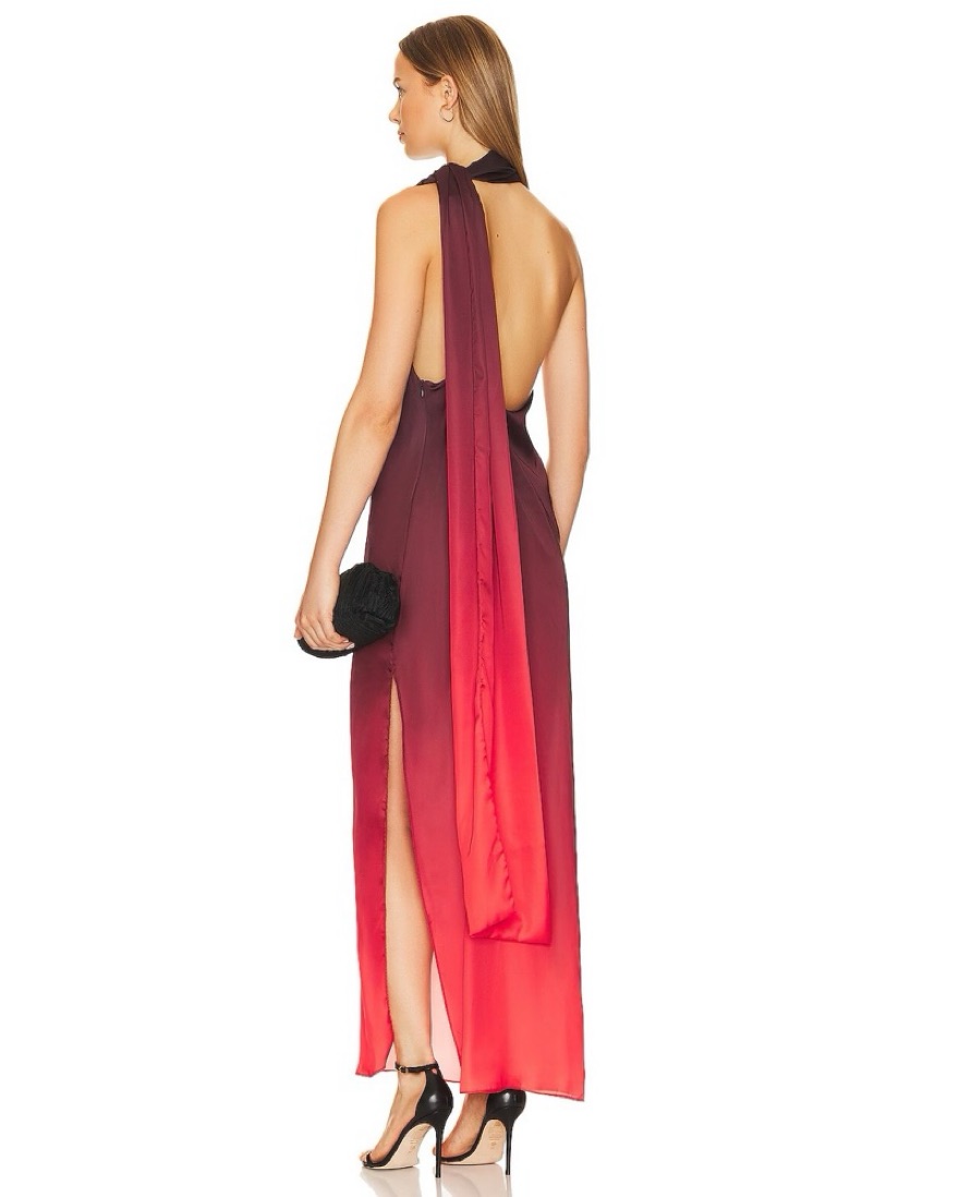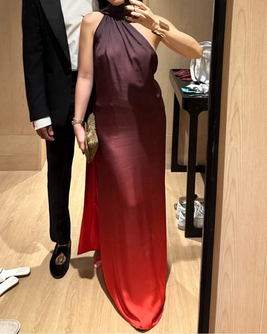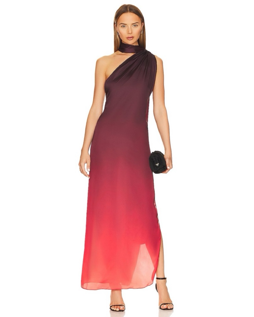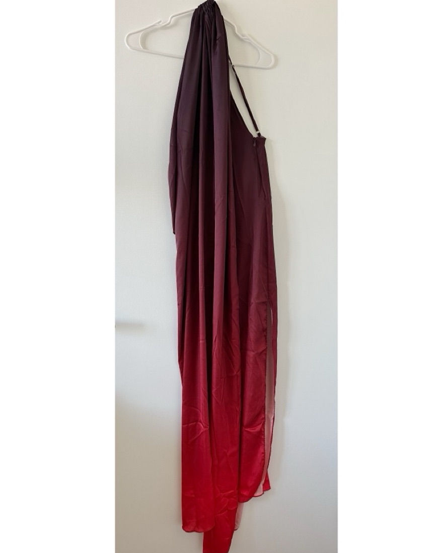 Step out in style with this elegant ombre one-shoulder dress. This dress features a stunning gradient from deep purple to vibrant red.