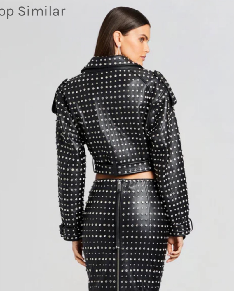 Retrofete cropped Icon Jacket with silver toned rhinestone gemstone studs. Belt loops on the bottom along with an adjustable belt. Oversized wide shoulder fit. Model is wearing a medium and is 5’10”. The size large fits as a wide oversized kind of regular length jacket if you are a size small.