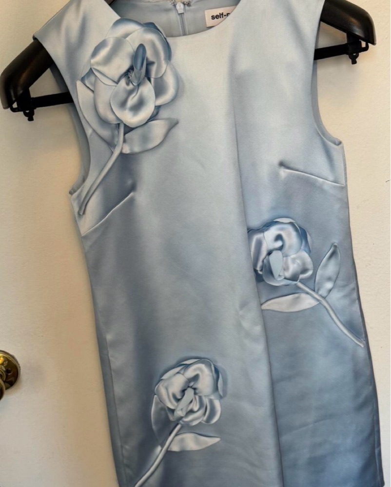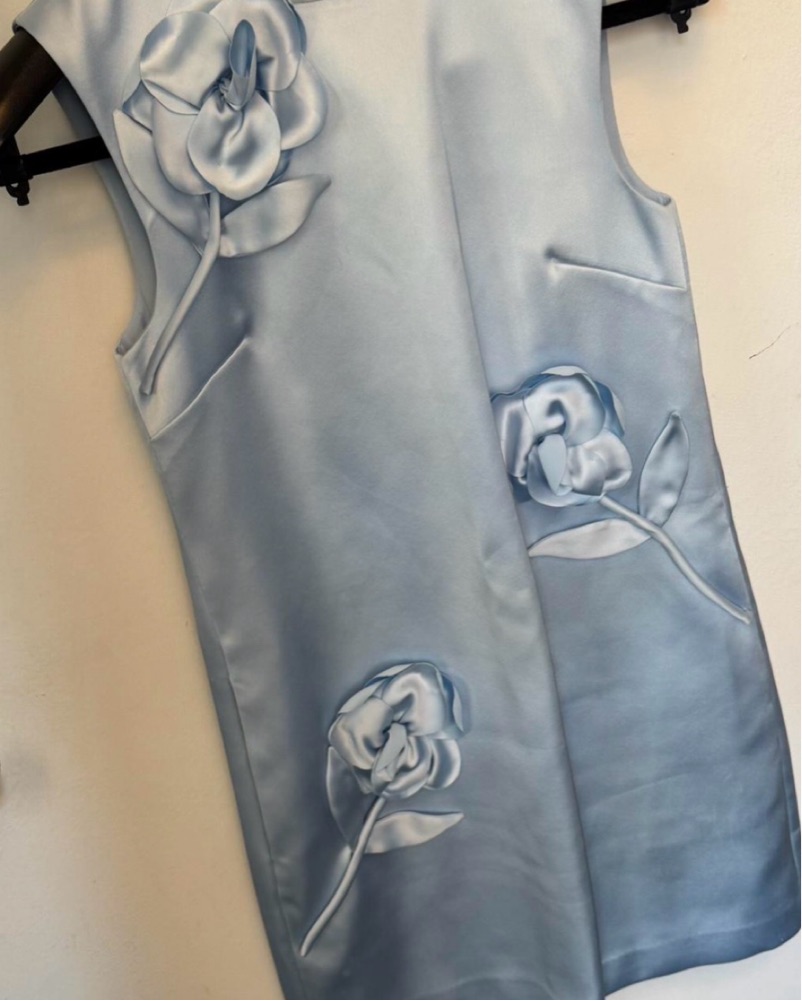This stunning satin dress is perfect for a special occasion. The delicate floral appliques add a touch of refined elegance.