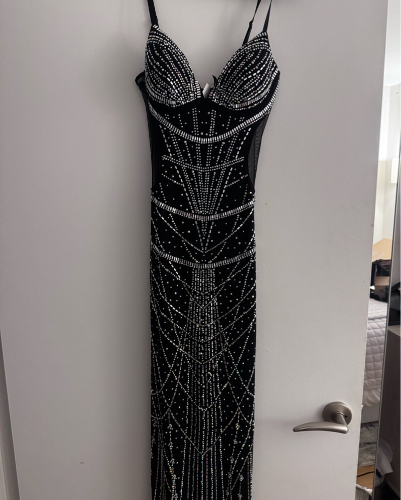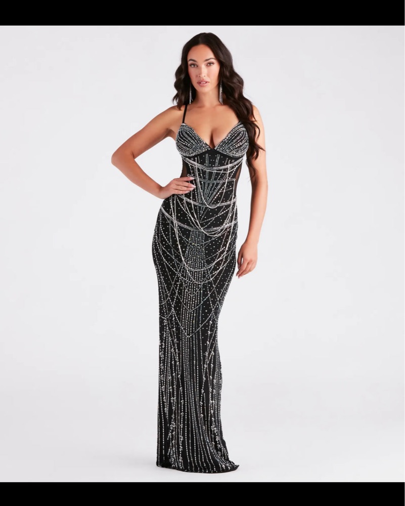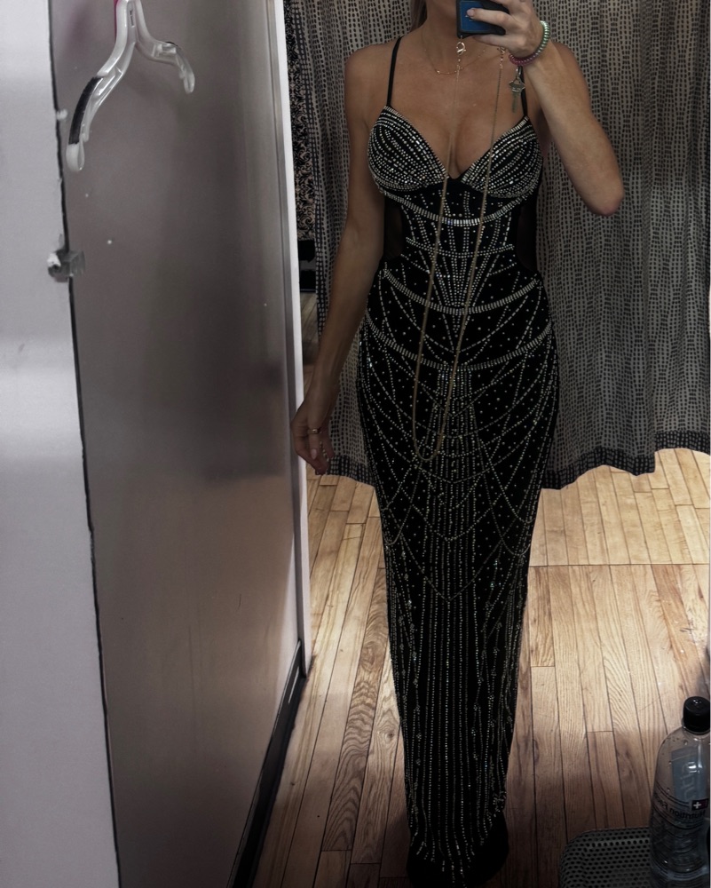 Used beautiful and form flattering rhinestone dress. This dress has been altered and does not have the rhinestone draping as they broke off and had to be removed.