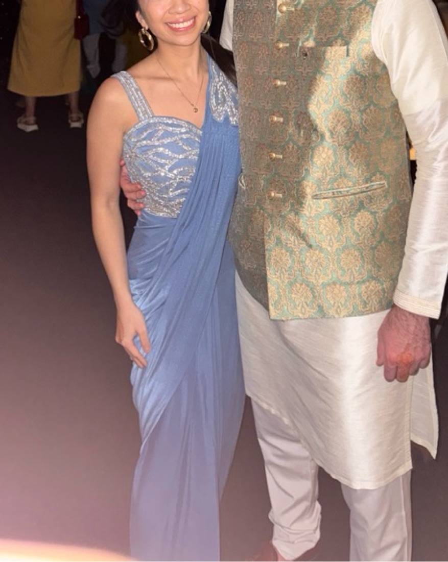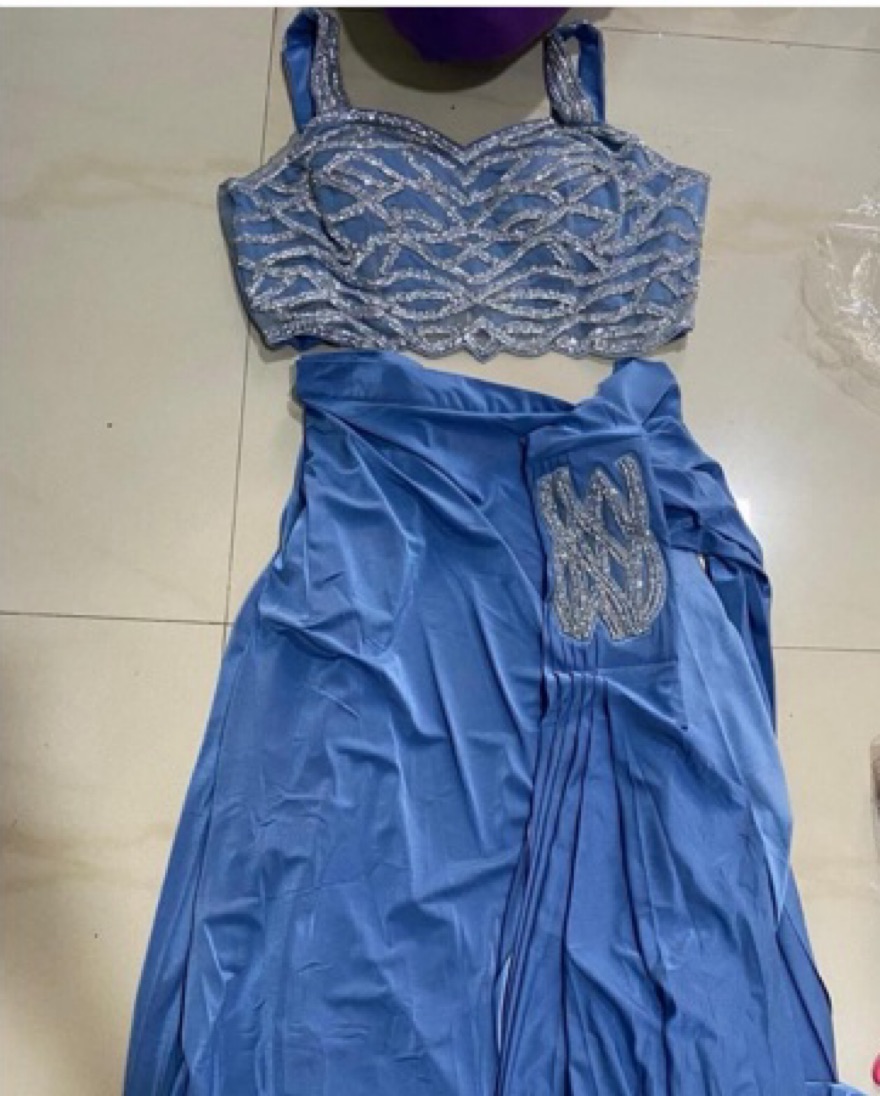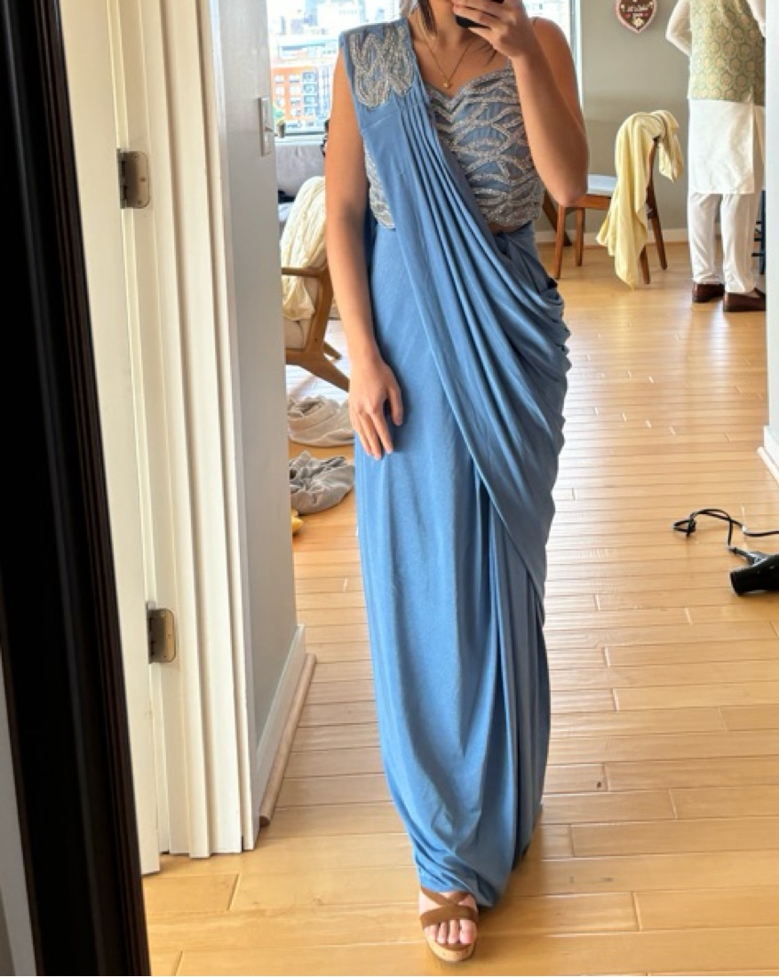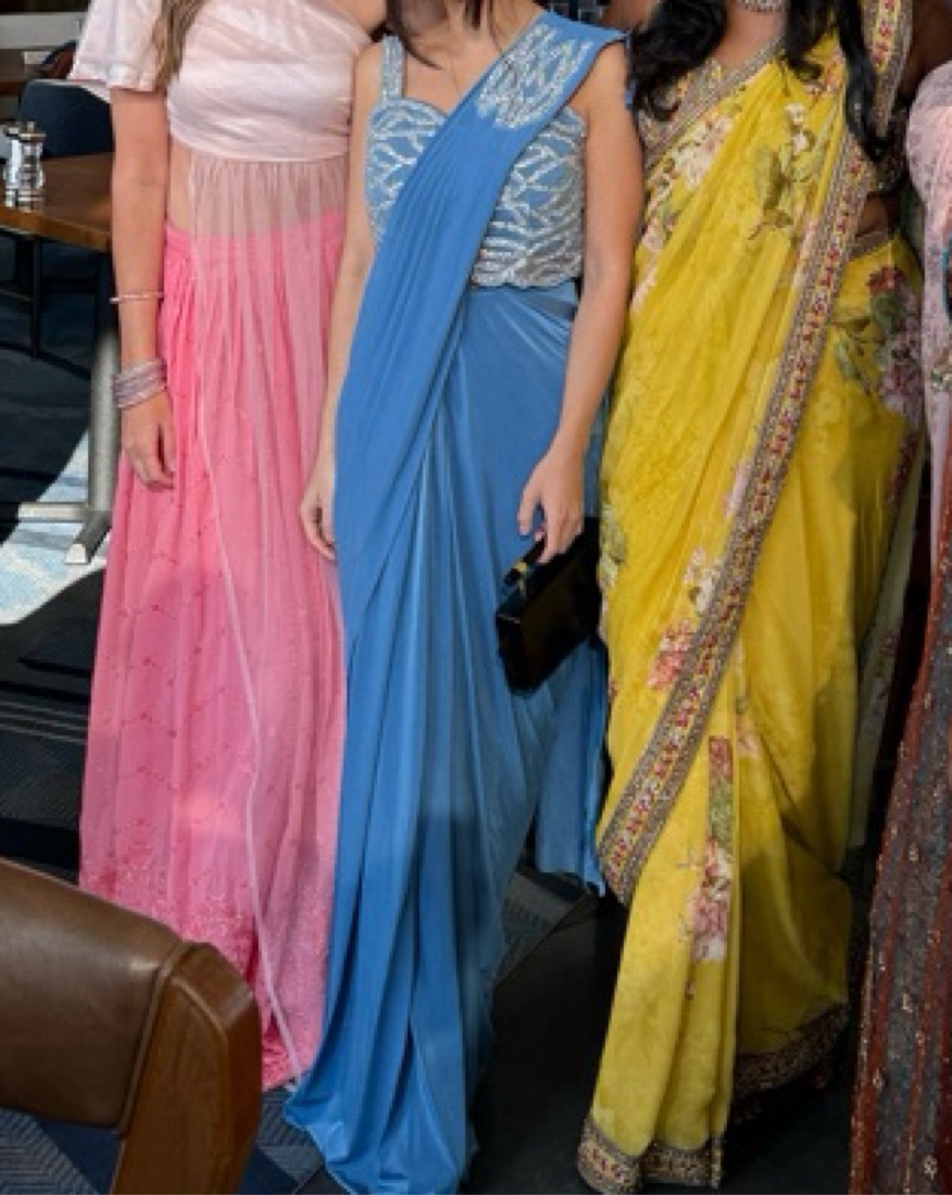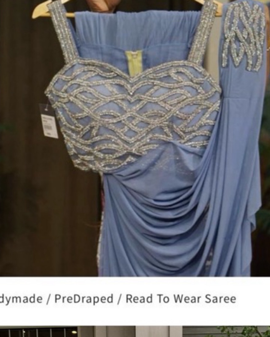 Worn once gorgeous cerulean blue predraped saree. Got so many compliments and easily adjustable for different heights. For reference I’m about 5’0 and I wore a 4 inch wedge but could have easily untucked more material to fit 5’2-5’5. Blouse is for size 32”.