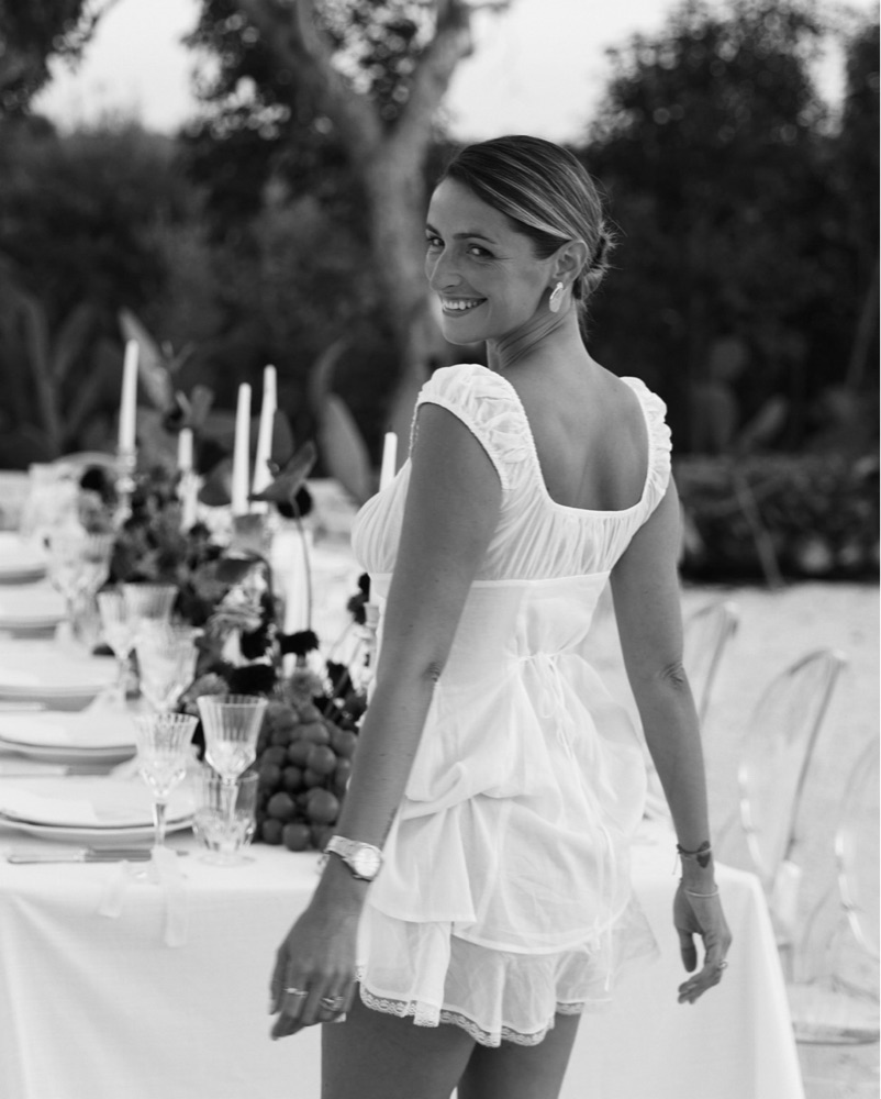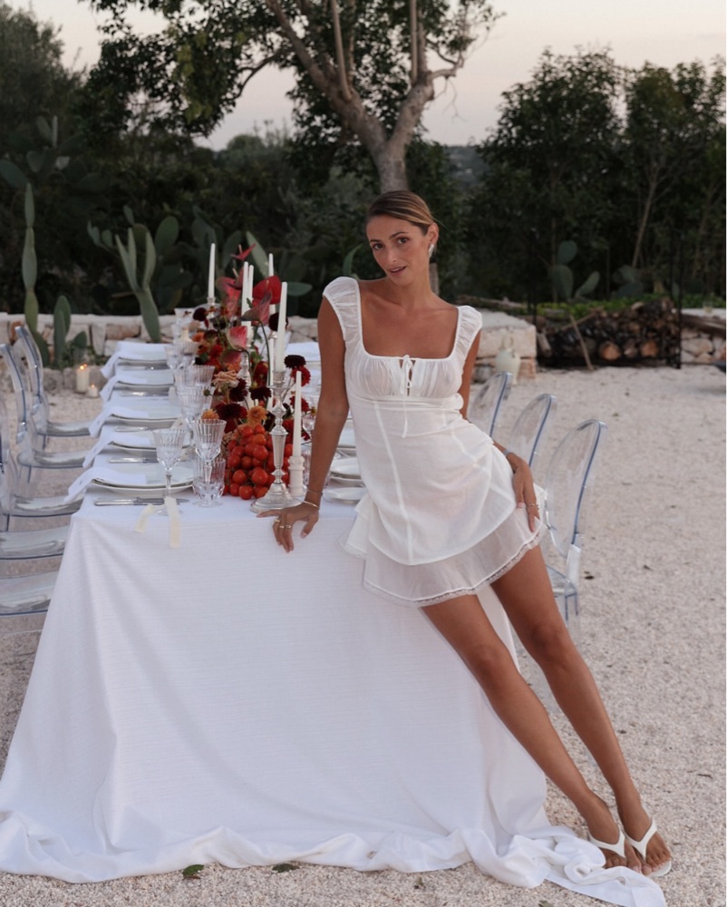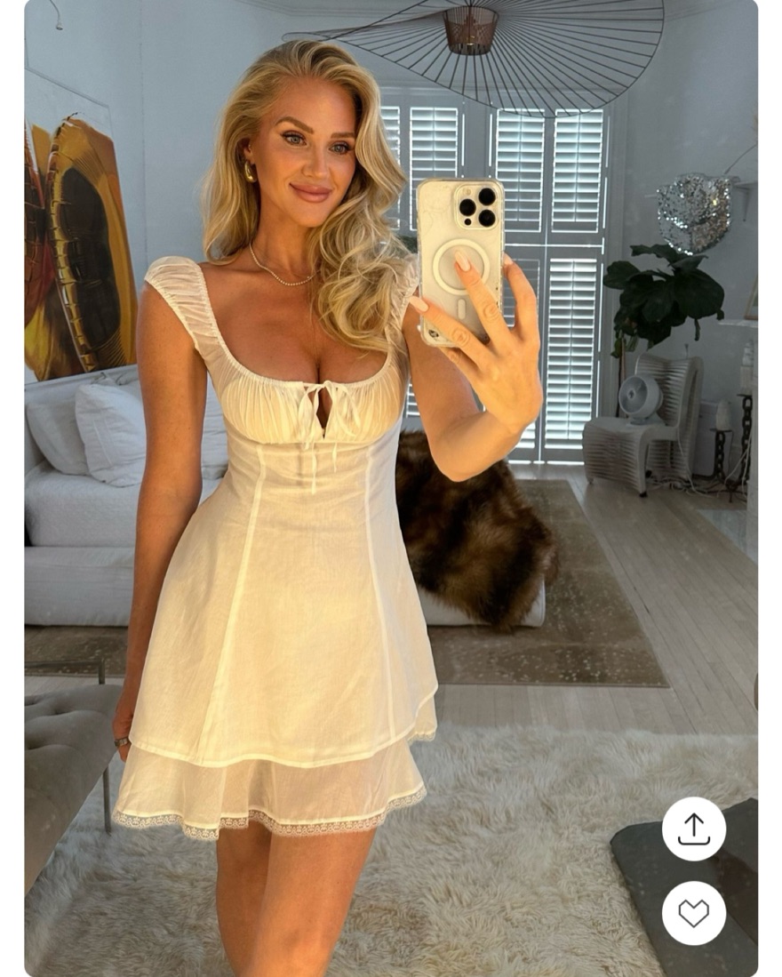 Demure but sexy. Such a cute summer dress. 100% cotton, partially lined, elastic trim at shoulder straps and adjustable front tie. Semi-sheer. Please treat with care and do not wash.