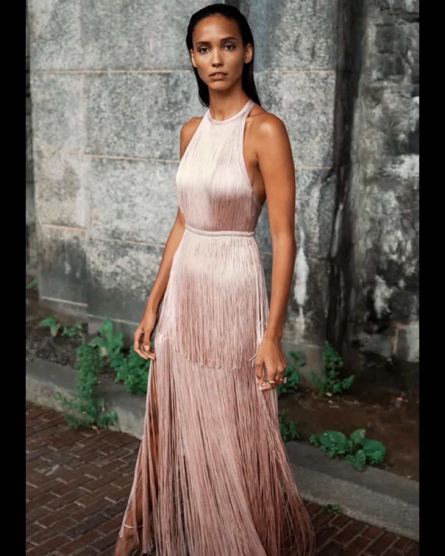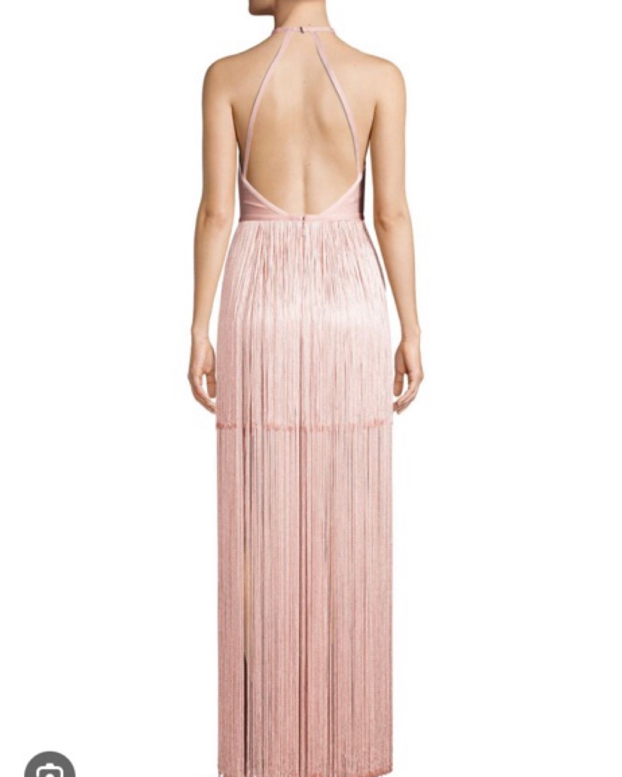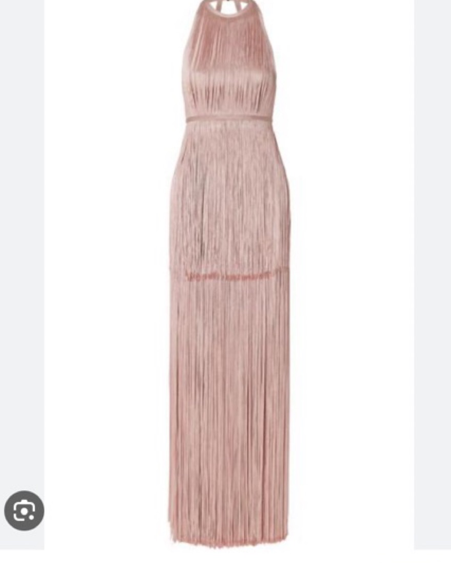 Amazing floor length fringe dress with an open back. I am 5ft 5.5in an had to wear platform shows so wouldn’t reccomend for someone much shorter. Fit well as a size 6-8.