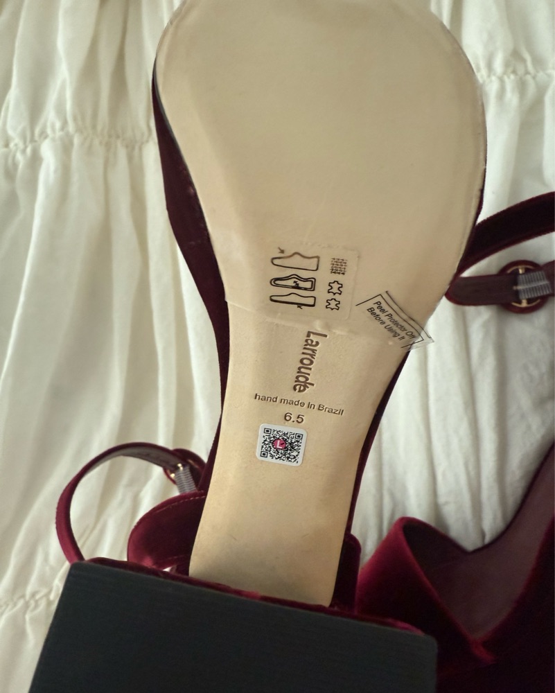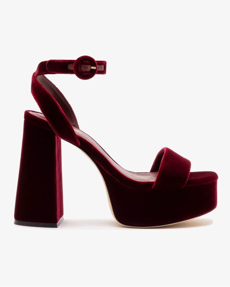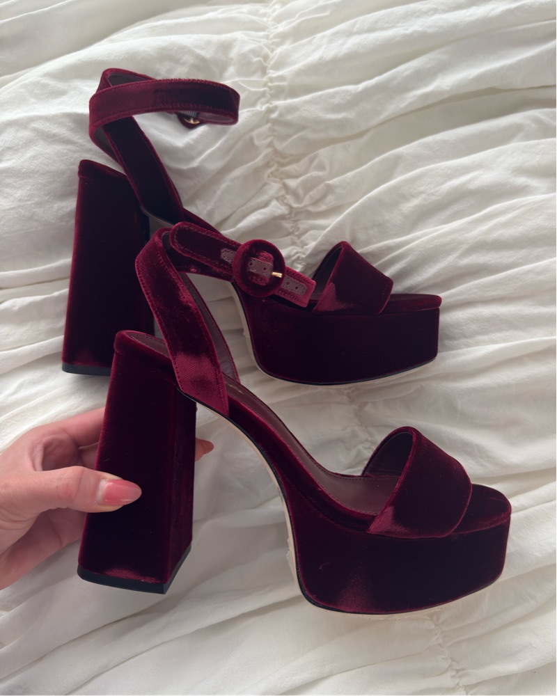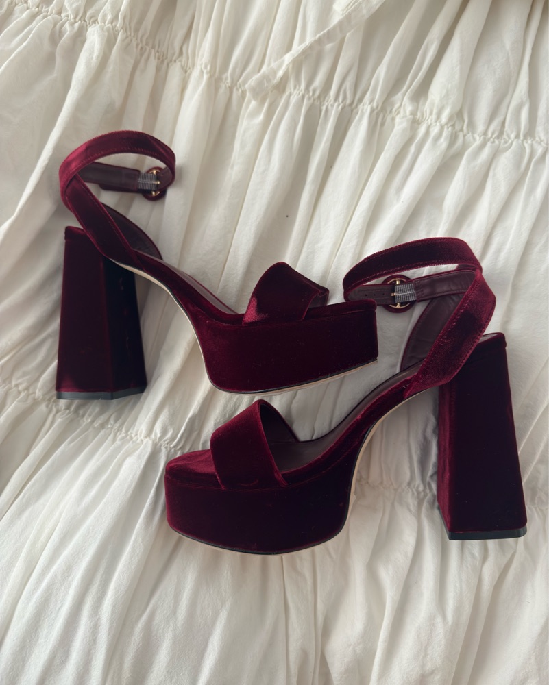 - gorgeous Wine / Deep Burgundy Color - Velvet fabric - Open round toe - Adjustable ankle strap - 4.5 inches block heel - 2 inches platform - Leather sole & Insole with memory foam cushion