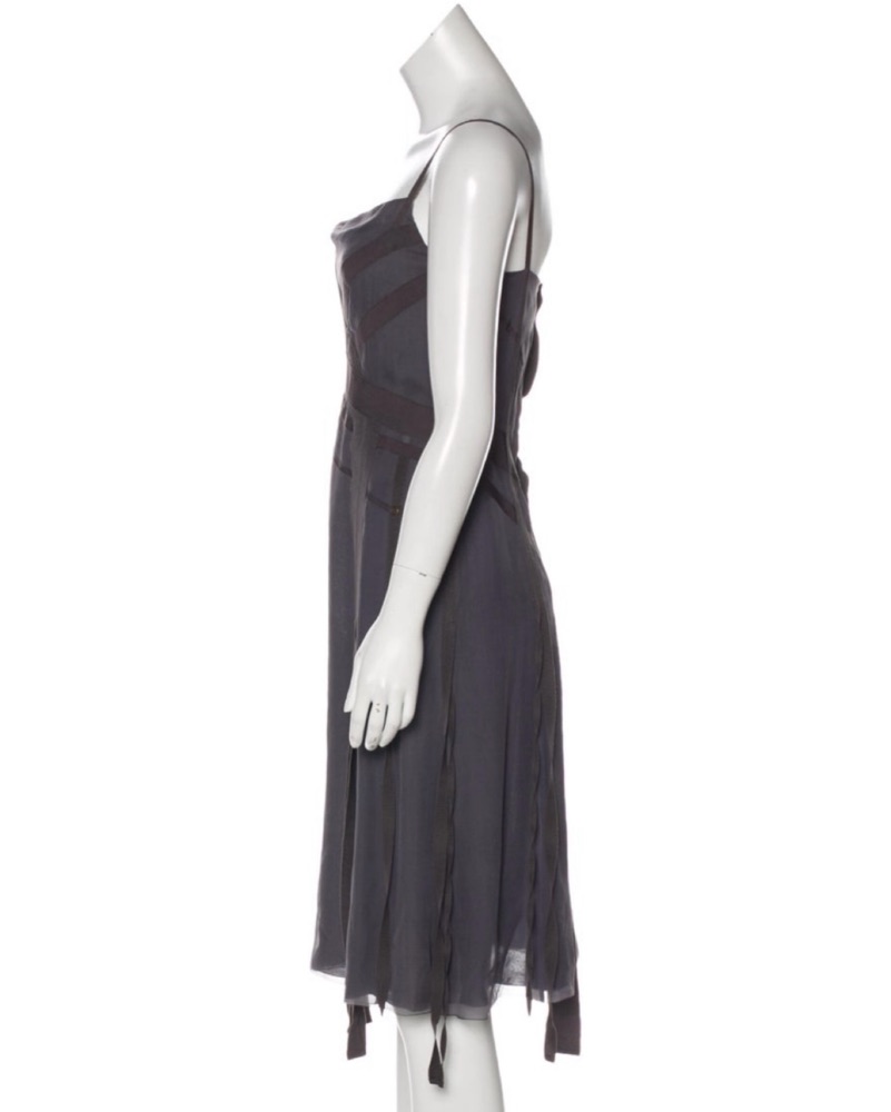 Grey Chanel silk sleeveless midi dress with square neck, strap accents throughout, interlocking CC adornment at waist, concealed zip closure and snap closures at back. From the Fall 2004 Collection.