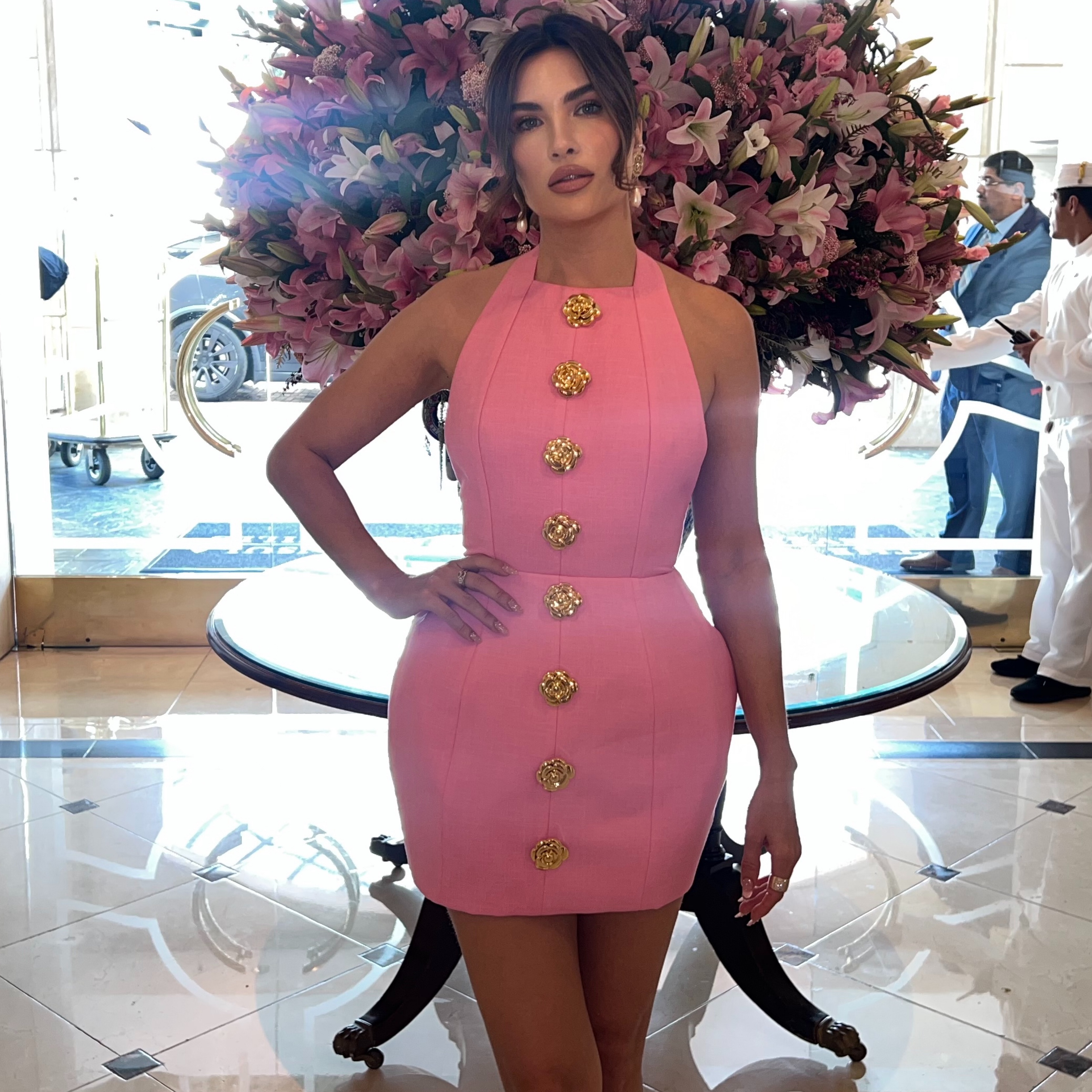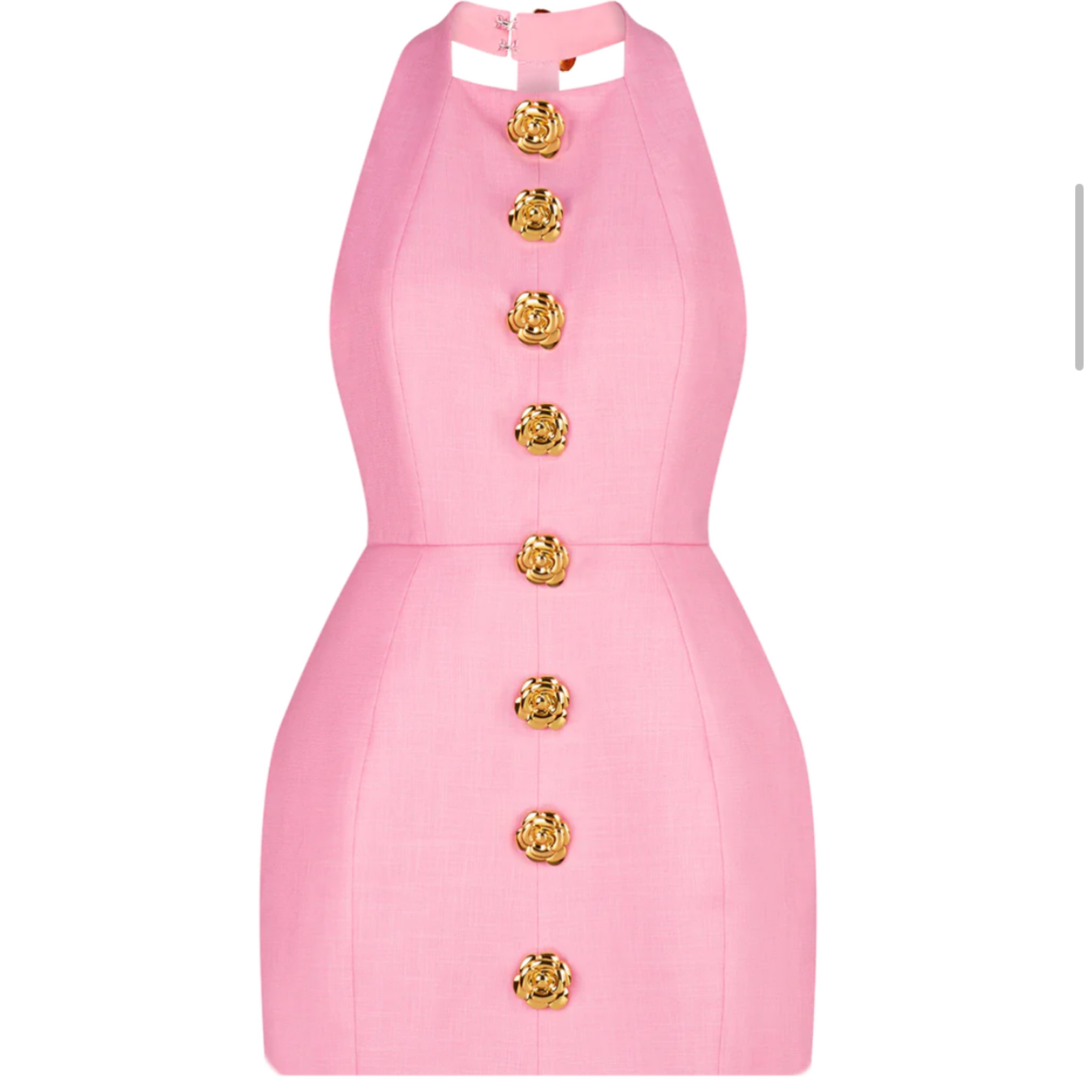 Pretty pink dress wirh gold roses as buttons . Any ocassion!