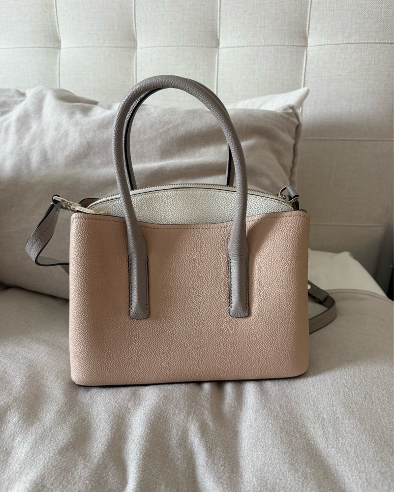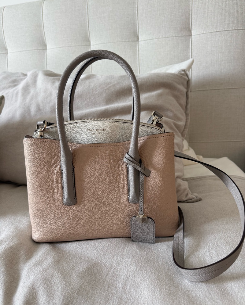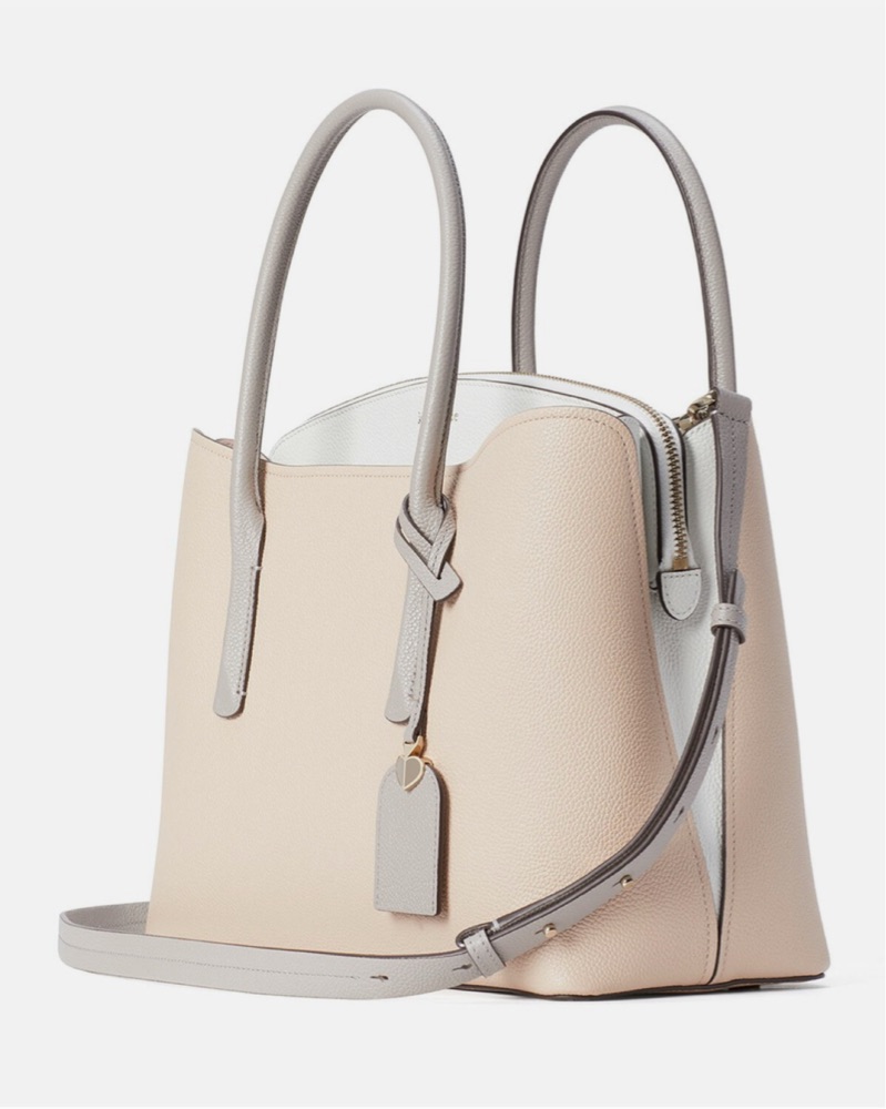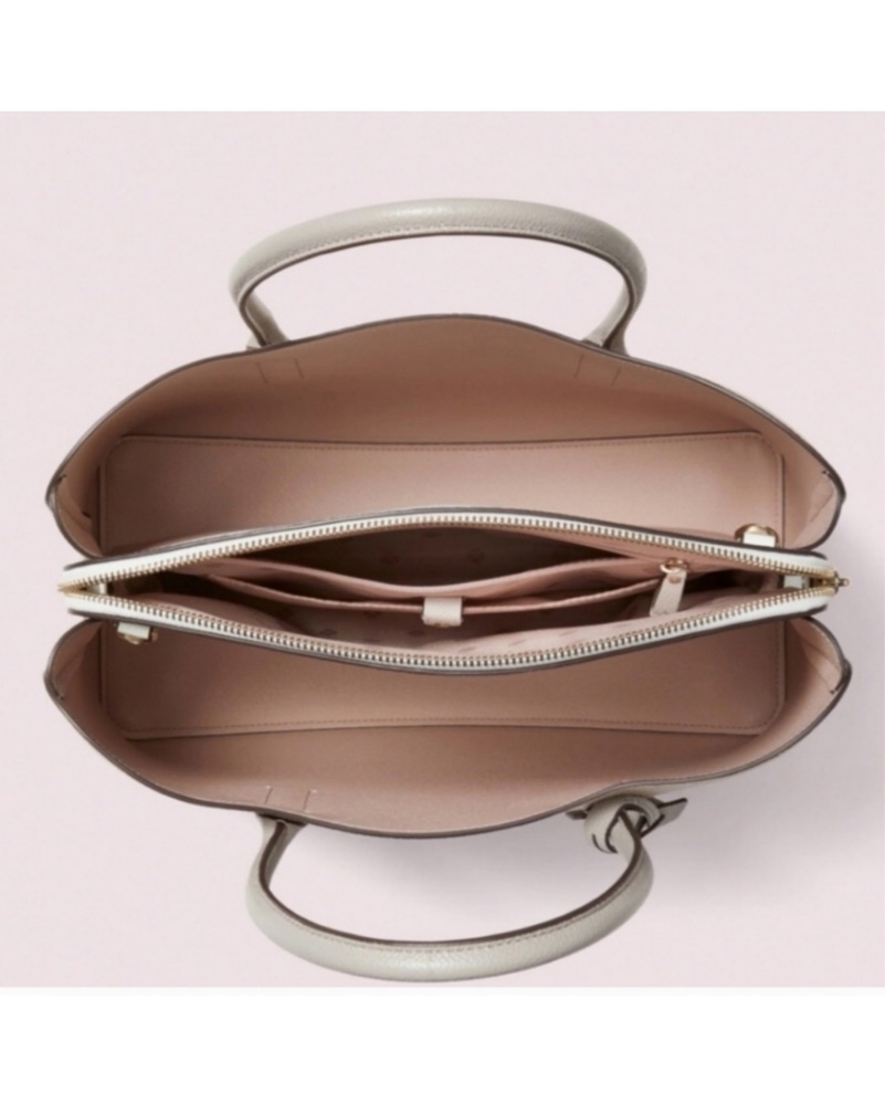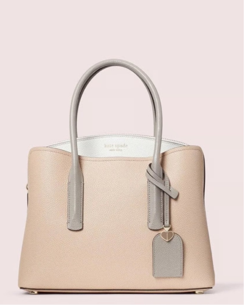 Kate spade Margaux Medium Satchel with zipper closure, two interior slide pockets, interior zipper pocket, dual exterior pockets, and optional adjustable shoulder strap. Genuine leather with foil embossed logo.