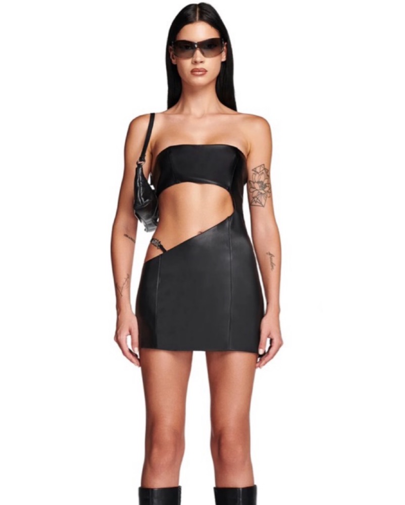 This versatile black bandeau dress is perfect for a night out or a special event. The figure-flattering silhouette and edgy leather-like material make it a stylish choice.